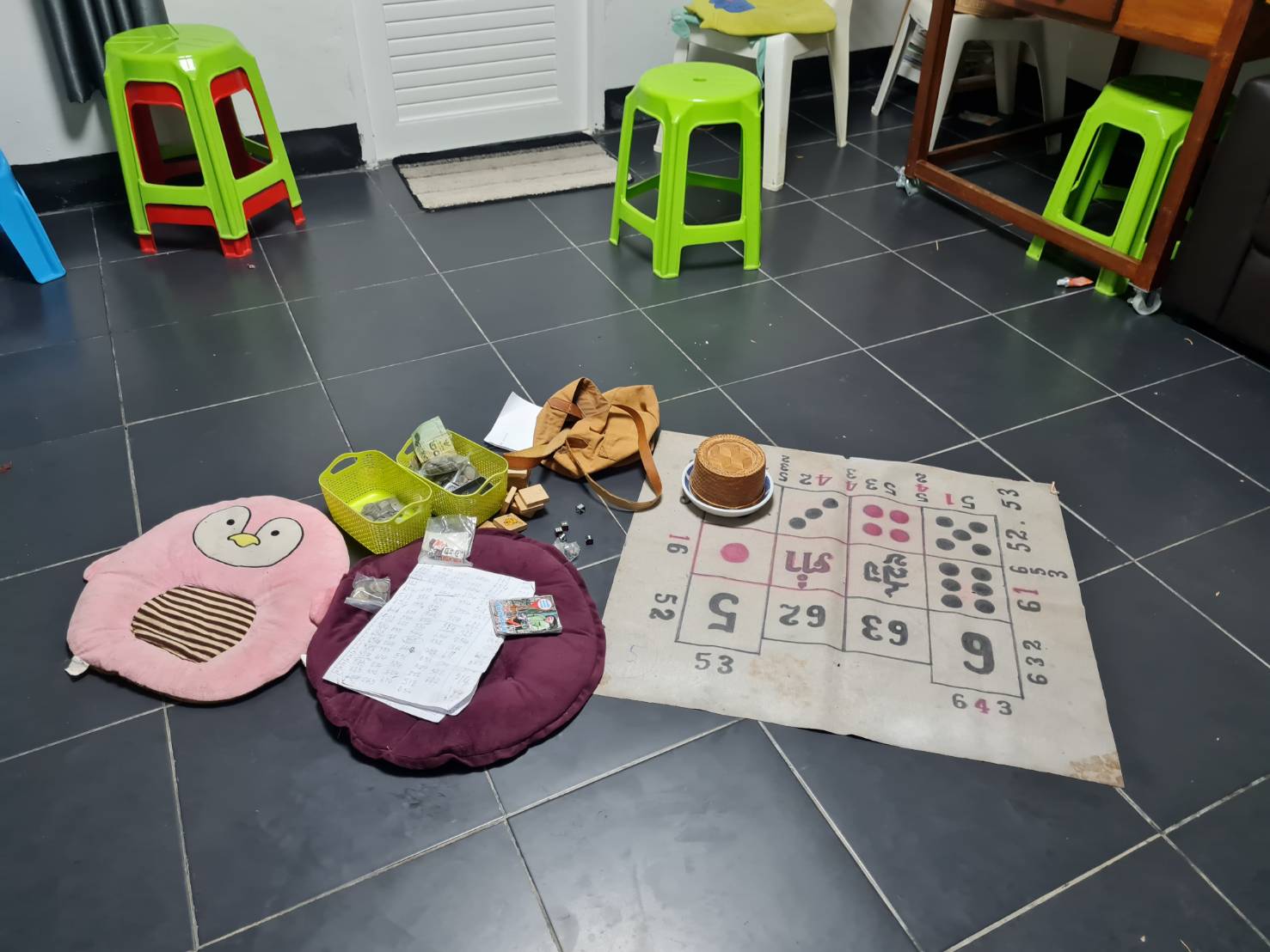 2) ตรวจยึดของกลาง 8 รายการ ได้แก่ ไพ่ 2 สำรับ เงินสด -880.00.-บาท เบาะรองนั่ง 2 ชิ้น เก้าอี้พลาสติก 2 ตัวจานรองพร้อมฝาครอบ 1 ชุด แผงบอกแต้ม 1 ผืน ลูกเต๋า 7 ลูก และตระกร้าพลาสติก 2 ใบ