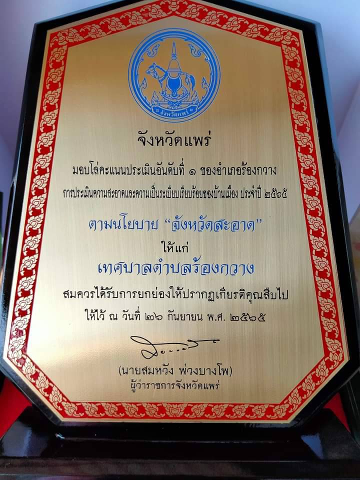 นายพิพัฒน์ ซื่อทรงธรรม นายกเทศมนตรีตำบลร้องกวาง อ.ร้องกวาง จ.แพร่ เป็นตัวแทนเทศบาลตำบลร้องกวาง รับโล่ประกาศเกียรติคุณ องค์กรปกครองส่วนท้องถิ่น ที่ผ่านเกณฑ์การประเมินความสะอาดและความเป็นระเบียบเรียบร้อยของบ้านเมือง ประจำปี พ.ศ.2565 โดยมีผลคะแนนประเมินเป็นอันดับที่ 1 ของอำเภอร้องกวาง จากนายสมเกียรติ อาจสังข์ นายอำเภอร้องกวาง ในการประชุมหัวหน้าส่วนราชการอำเภอร้องกวาง ประจำเดือน พฤศจิกายน 2565 วันที่ 1 พฤศจิกายน 2565 ณ หอประชุมอำเภอร้องกวาง