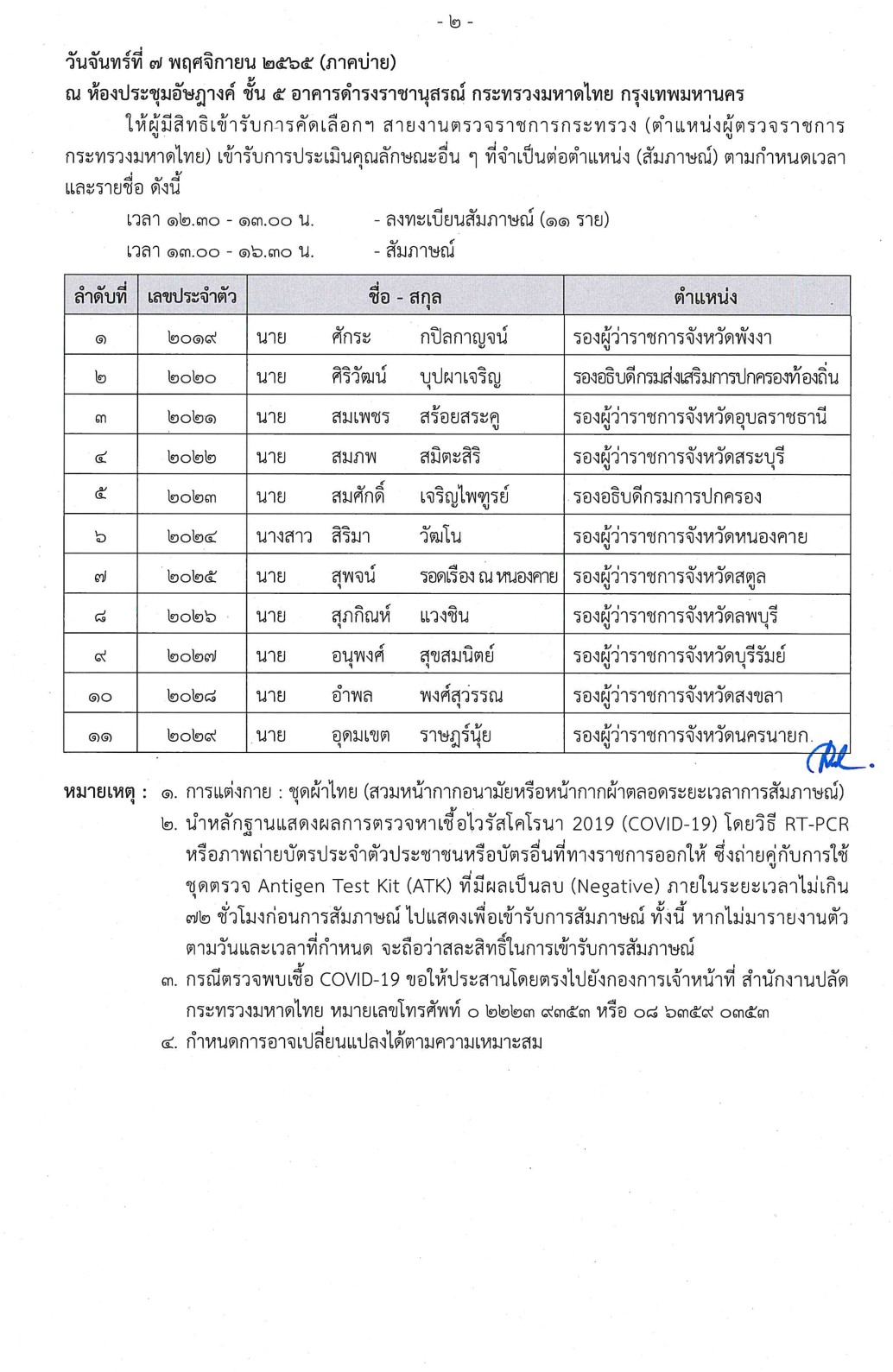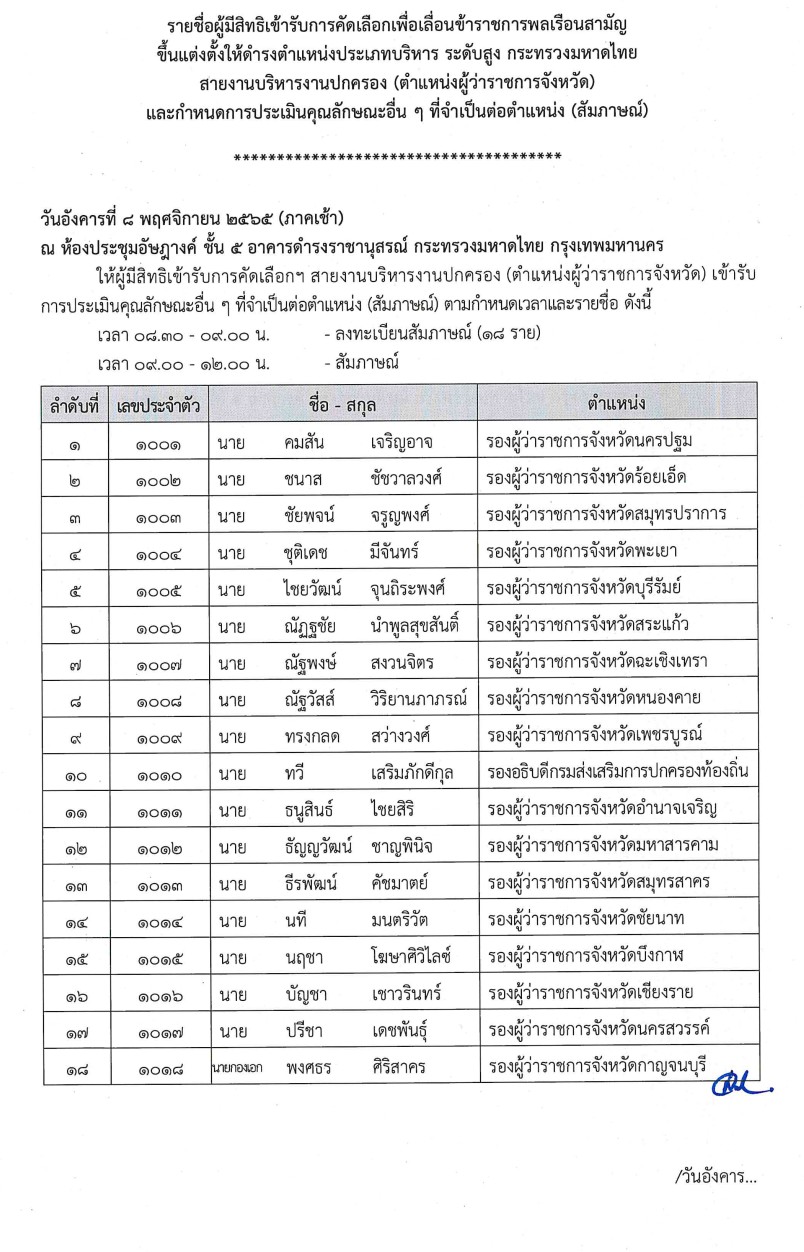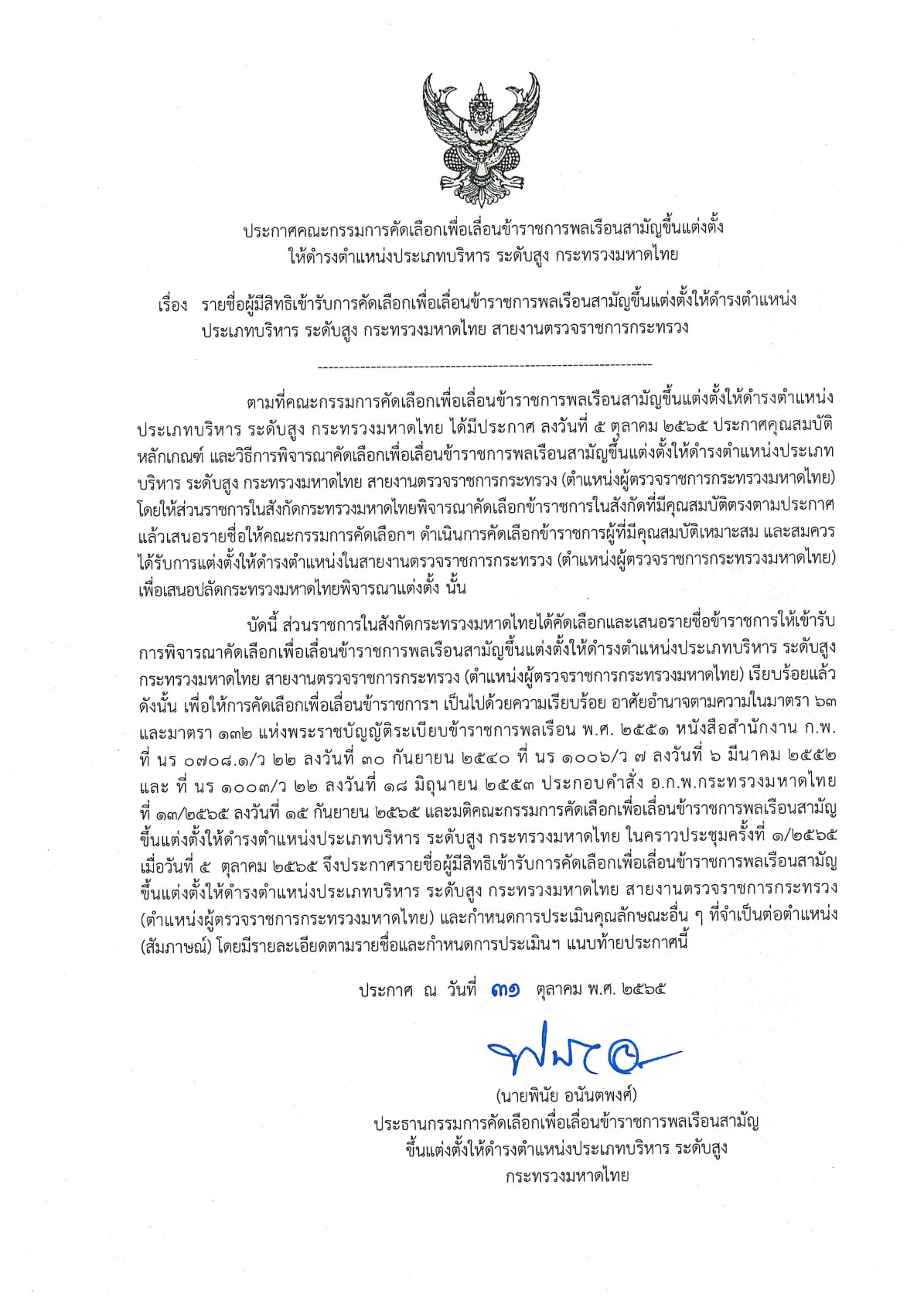 เมื่อวันที่ 5 ตุลาคม 2565 จึงประกาศรายชื่อผู้มีสิทธิเข้ารับการคัดเลือกเพื่อเลื่อนข้าราชการพลเรือนสามัญ ขึ้นแต่งตั้งให้ดำรงตำแหน่งประเภทบริหาร ระดับสูง กระทรวงมหาดไทย สายงานตรวจราชการกระทรวง (ตำแหน่งผู้ตรวจราชการกระทรวงมหาดไทย) และกำหนดการประเมินคุณลักษณะอื่นๆ ที่จำเป็นต่อตำแหน่ง (สัมภาษณ์ โดยมีรายละเอียดตามรายชื่อและกำหนดการประเมินฯ แนบท้ายประกาศนี้) ประกาศ ณ วันที่ 31ตุลาคม พ.ศ. 2565 นายพินัย อนันตพงศ์ประธานกรรมการคัดเลือกเพื่อเลื่อนข้าราชการพลเรือนสามัญ ขึ้นแต่งตั้งให้ดำรงตำแหน่งประเภทบริหาร ระดับสูงกระทรวงมหาดไทย