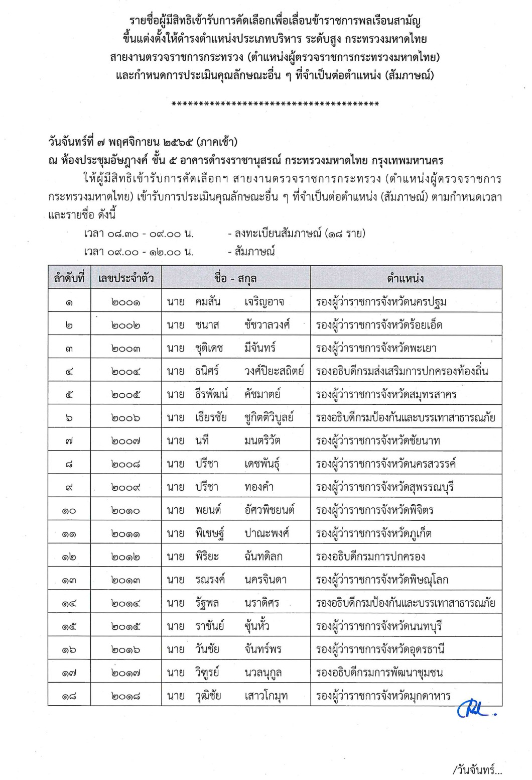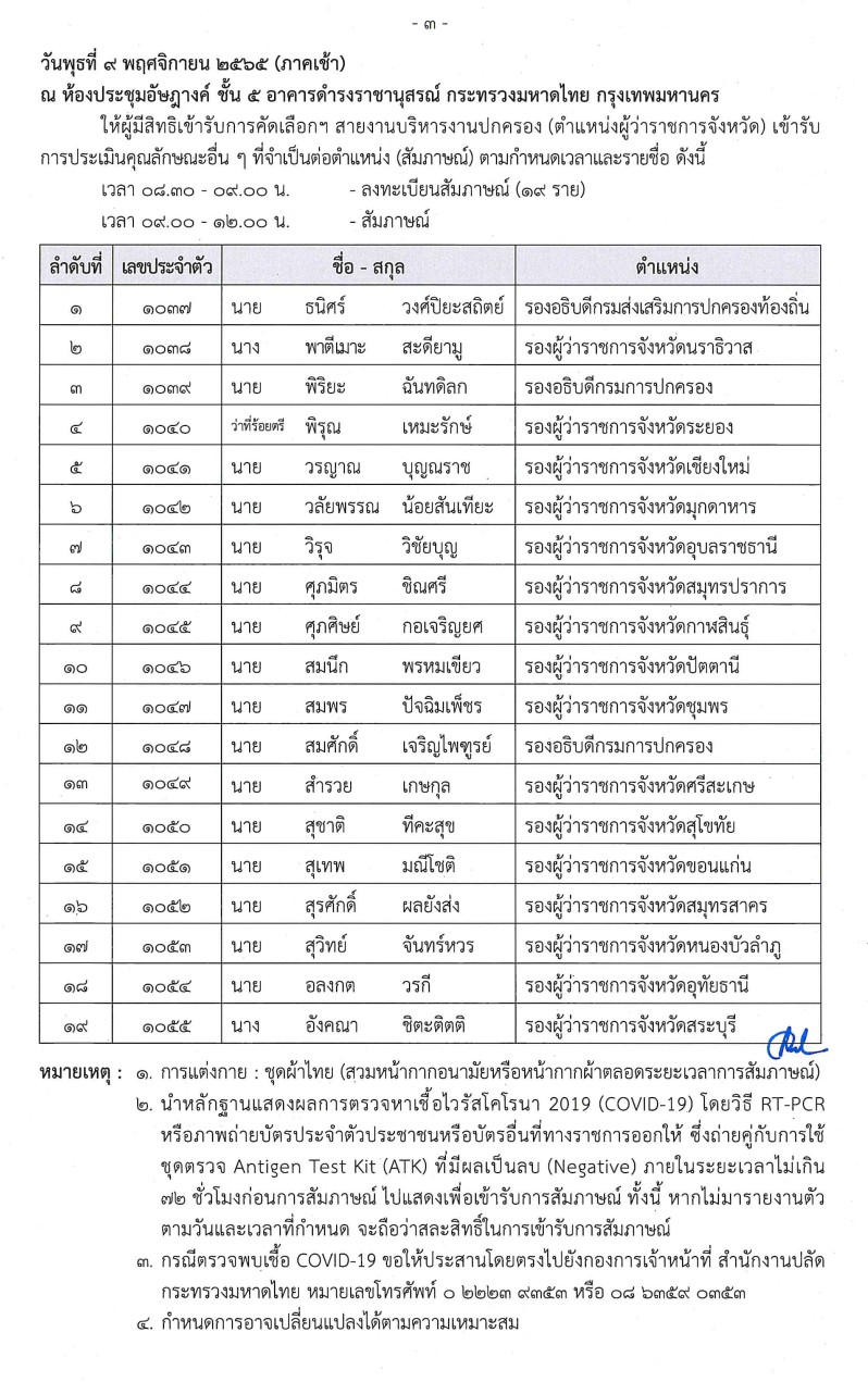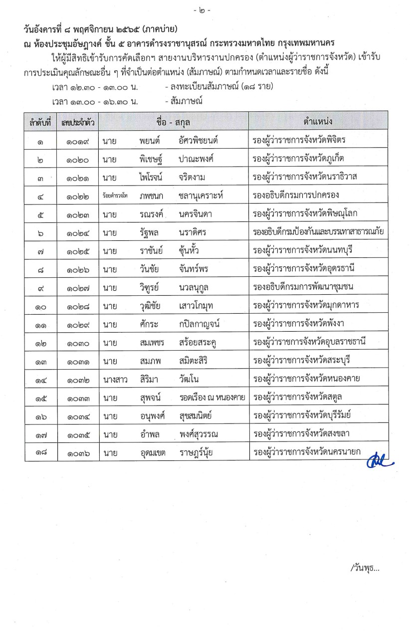ประกาศรายชื่อผู้มีสิทธิ์เข้ารับการคัดเลือกดำรงตำแหน่งผู้ว่าราชการจังหวัด และผู้ตรวจราชการกระทรวงมหาดไทย