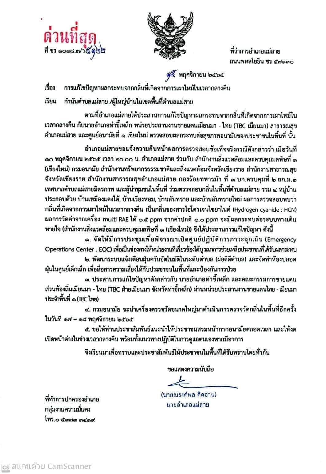 ล่าสุดในวันนี้ นายณรงค์พล คิดอ่าน นอภ.แม่สาย ได้ออกหนังสือด่วนที่สุดไปถึงกำนันผู้ใหญ่บ้านในพื้นที่ ต.แม่สาย ในเรื่องเกี่ยวกับการแก้ไขปัญหาผลกระทบจากกลิ่น ที่เกิดจากการเผาไหม้ในเวลากลางคืน โดยมีใจความตามหนังสือว่า