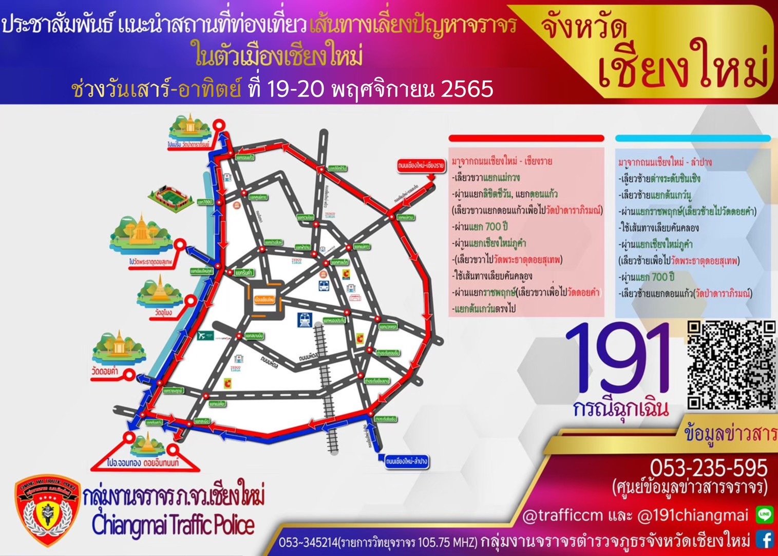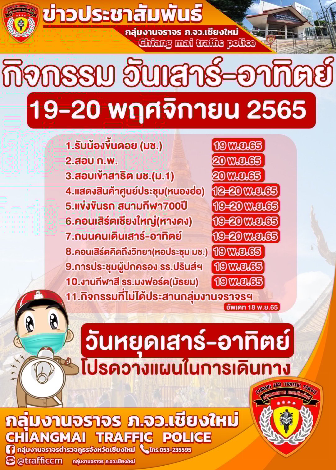 เน้นย้ำ!! ในวันเสาร์-อาทิตย์นี้ 19-20 พฤศจิกายน 2565 มีกิจกรรมในตัวเมืองเชียงใหม่และอำเภอใกล้เคียง คาดว่าจะมีปริมาณรถสะสมมากในตัวเมืองเชียงใหม่ จราจรเชียงใหม่ฝากติดตามข้อมูลข่าวสารในการวางแผนการเดินทางหรือเผื่อระยะเวลาในการเดินทางเส้นทางดังกล่าวด้วย