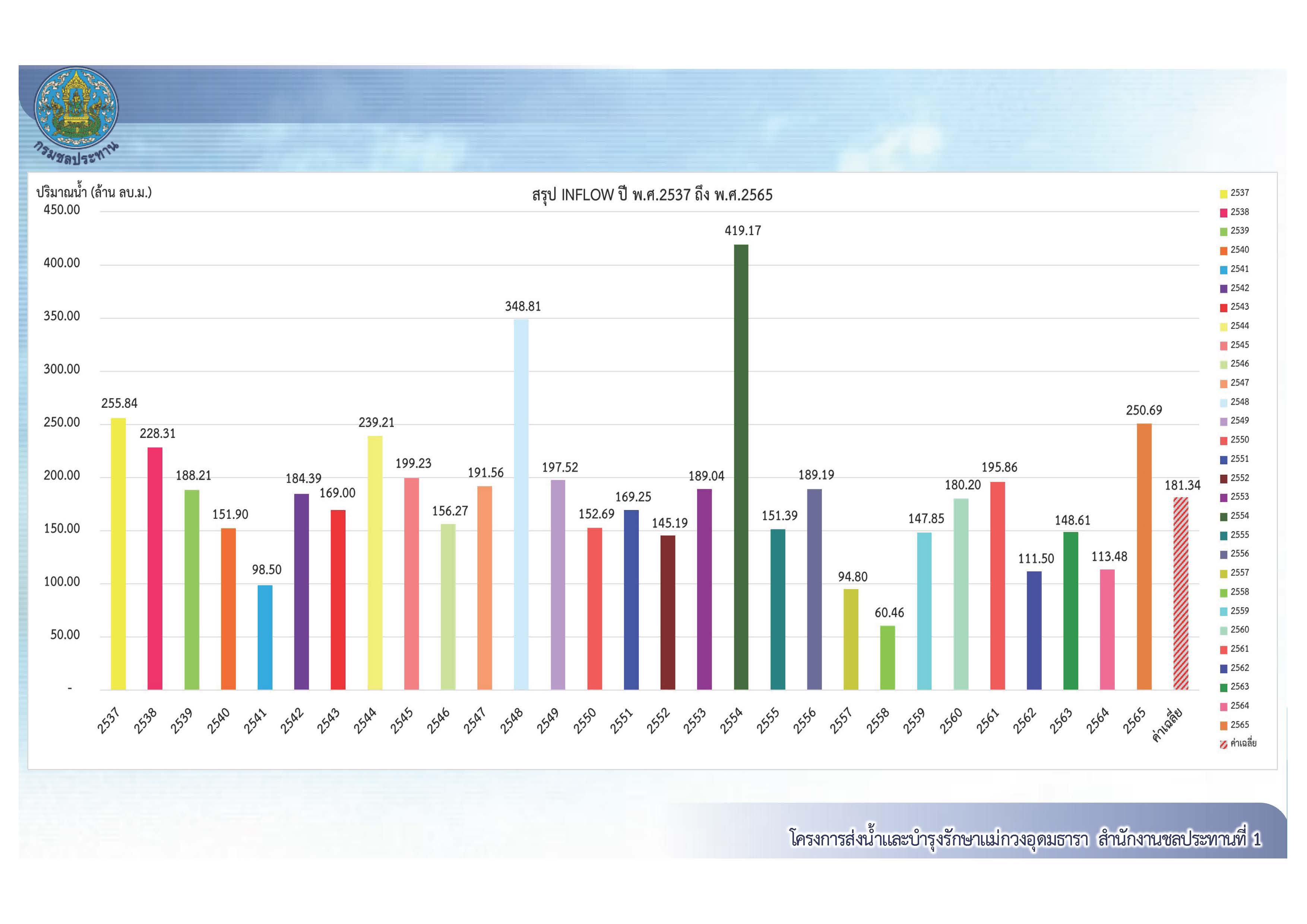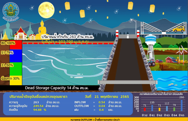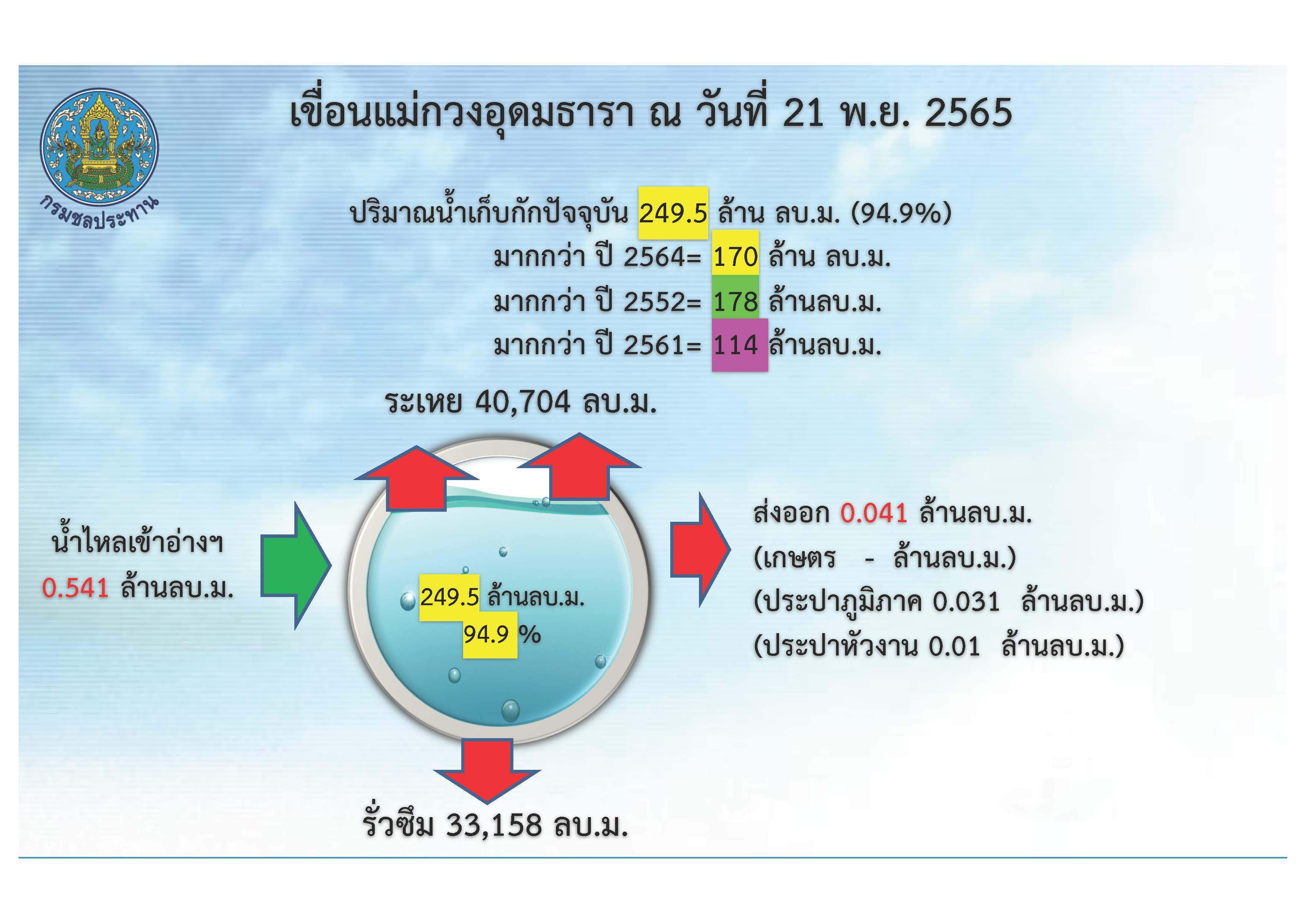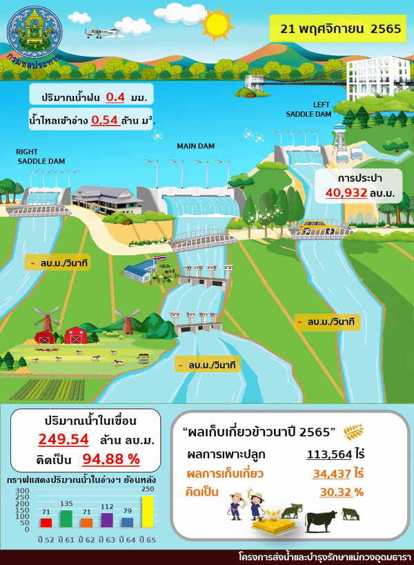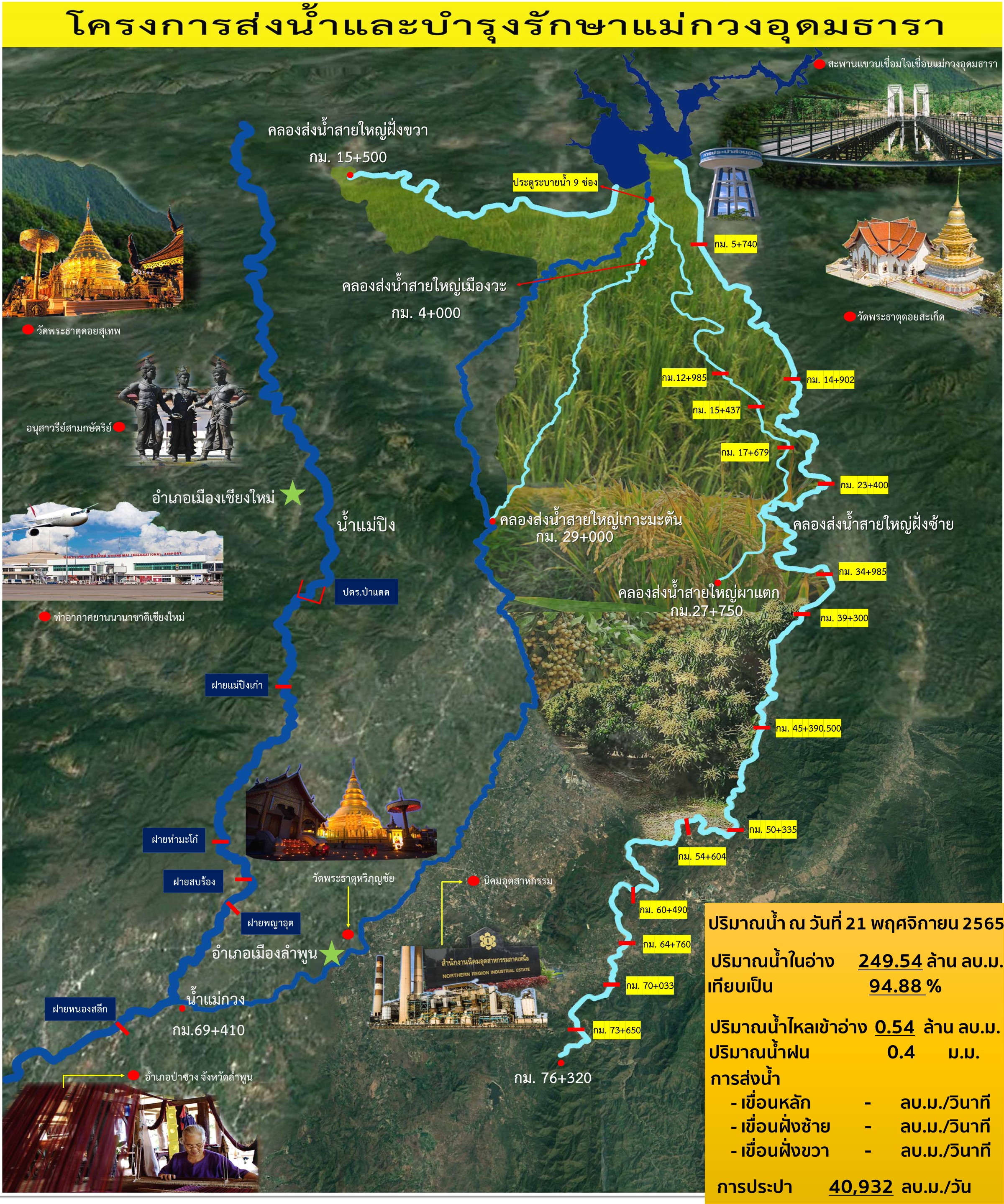 วันที่ 21 พ.ย. 65 ที่ผ่านมา ที่สำนักงานโครงการส่งน้ำและบำรุงรักษาแม่กวงอุดมธารา นายอัธยา อรรณพเพ็ชร ผู้อำนวยการโครงการฯ (ผคบ.แม่กวงฯ) ชี้แจงถึงสถานการณ์น้ำในอ่างเก็บน้ำเขื่อนแม่กวงอุดมธารา และการบริหารจัดการน้ำในช่วงฤดูแล้ง 2566 ว่า ข้อมูลด้านอุทกวิทยาของเขื่อนแม่กวงฯ จะมีปริมาณฝนเฉลี่ยอยู่ที่ 1,208 มม. ต่อปี ในปี 2565 นี้ มีปริมาณฝนอยู่ที่ 1,628 มม. ซึ่งมากกว่าค่าเฉลี่ย 30% ส่งผลให้มีน้ำไหลเข้าเขื่อนราว 250 ล้าน ลบ.ม. เทียบกับค่าเฉลี่ยตั้งแต่ปี 2537 ถึงปัจจุบัน มีค่าเฉลี่ยน้ำของเขื่อนอยู่ที่ 181 ล้าน ลบ.ม. ทำให้สถานการณ์น้ำของอ่างเก็บน้ำเขื่อนแม่กวงฯ มีปริมาณน้ำอยู่ที่ 249.5 ล้าน ลบ.ม. คิดเป็น 94.5% ของความจุ ปีนี้จึงเป็นปีที่ปริมาณน้ำในเขื่อนแม่กวงฯ มีปริมาณค่อนข้างมากนับตั้งแต่ปี 2554 คือ 11 ปีที่ผ่านมา ปีนี้มีปริมาณน้ำมากที่สุด