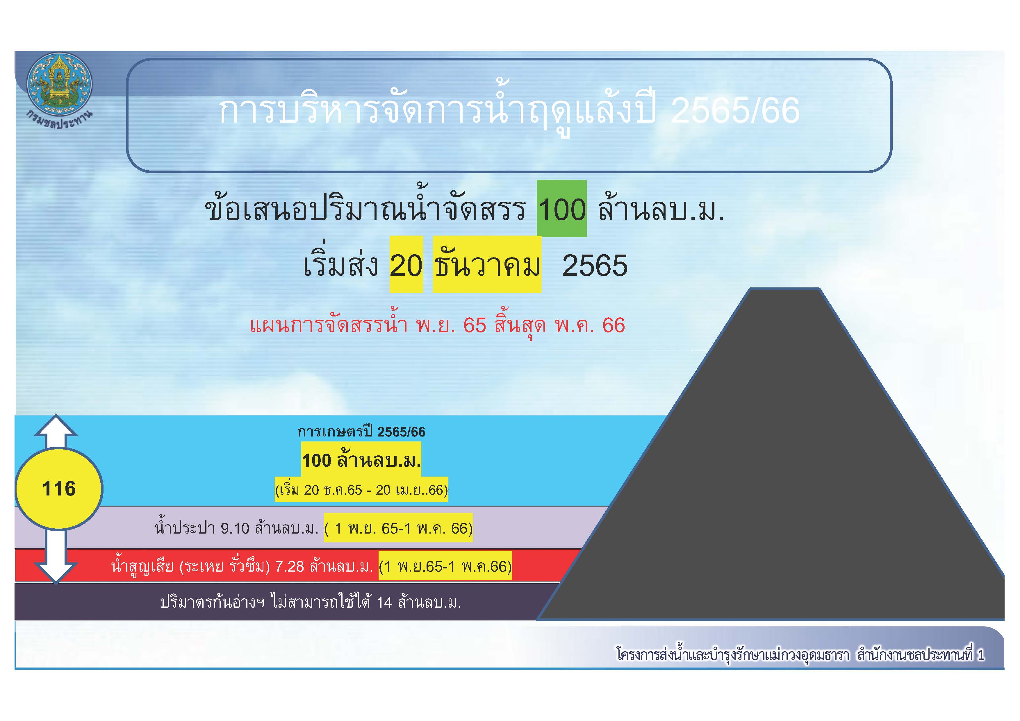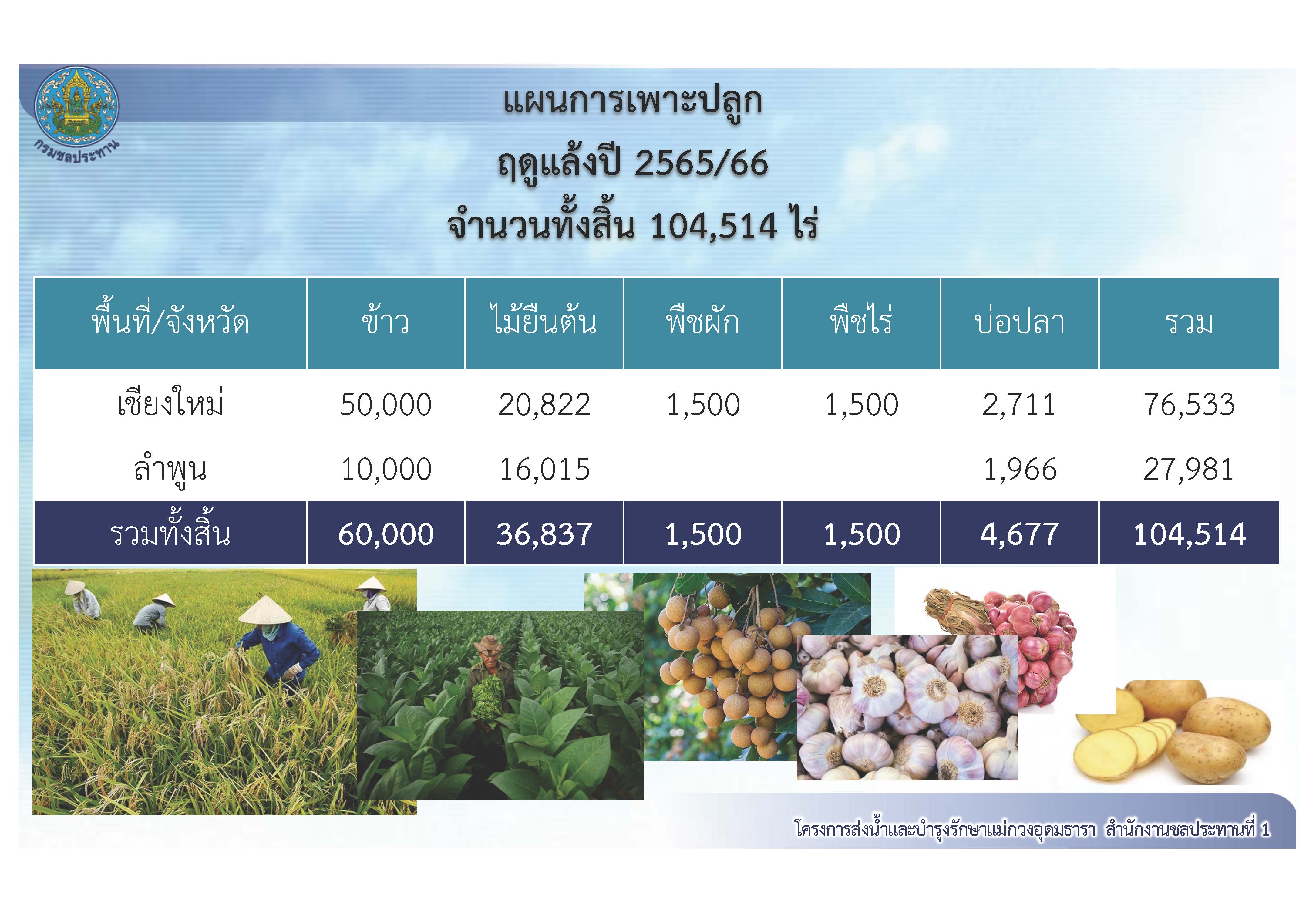 สำหรับการบริการจัดการน้ำในช่วงฤดูแล้ง ปี 2566 ที่จะถึง นายอัธยาฯ ชี้แจงว่า จากปริมาณที่คาดการณ์ไว้ที่ราว 257 ล้าน ลบ.ม. ซึ่งเมื่อวันที่ 11 พ.ย. 65 ได้มีการประชุมร่วมกลุ่มผู้ใช้น้ำ หรือ JMC ฝ่ายปกครอง ผู้นำท้องที่ ท้องถิ่น และเจ้าหน้าที่กลุ่มบริหารจัดการน้ำ เพื่อหามติร่วมกันในการบริหารจัดการน้ำ โดยจากปริมาณน้ำที่คาดการณ์ไว้ มีการวางแผนให้เกษตรกรสามารถทำนาปรังได้ 2 ปี ซึ่งต้องมีการวางแผนตั้งแต่ปีปลูกที่จะถึงนี้ เผื่อไปถึงฤดูปลูกปีหน้าด้วย โดยยึดตามมาตรการทั้ง 10 ประการของ สทนช. จึงมีข้อตกลงร่วมกันในที่ประชุมว่า จะเริ่มมีการส่งน้ำในวันที่ 20 ธ.ค.2565 โดยส่งทั้ง 3 สายคลอง ได้แก่ คลองฝั่งขวา คลองหลัก และคลองฝั่งซ้าย ซึ่งได้มีการประชาสัมพันธ์ไปยังกลุ่มผู้ใช้น้ำ เกษตรกร ผ่านช่องทางต่างๆ ที่ใช้ติดต่อกันเป็นประจำให้ทราบแล้ว โดยมีแผนที่วางไว้จะมีการปลูกข้าวนาปรังราว 60,000 ไร่ รวมทั้งพื้นที่ที่เป็นพืชสวนคือ ลำไย และไม้ผลต่างๆ มีพื้นที่ราว 104,000 ไร่