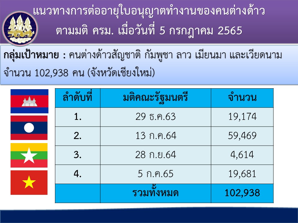 กรณีแรงงานต่างด้าวที่ได้รับการอนุญาตให้อยู่ในราชอาณาจักรเป็นชั่วคราว (visa) ภายในวันที่ 1 สิงหาคม 2565 ต่อใบอนุญาตทำงาน 2 ปี ถึงวันที่ 13 กุมภาพันธ์ 2568 ส่วนกรณีแรงงานต่างด้าวที่ได้รับการอนุญาตให้อยู่ในราชอาณาจักรเป็นชั่วคราว (visa) ภายในวันที่ 2 สิงหาคม 2565 ถึงวันที่ 13 กุมภาพันธ์ 2566 ต่อใบอนุญาตทำงานได้ครั้งละ 1 ปี ครั้งที่ 1 ถึงวันที่ 13 กุมภาพันธ์ 2567 และครั้งที่ 2 ถึงวันที่ 13 กุมภาพันธ์ 2568 ทั้งนี้ แรงงานต่างด้าวที่ทำงานกับนายจ้างหรือสถานประกอบการที่อยู่ภายใต้บังคับกฎหมายว่าด้วยการประกันสังคมให้ดำเนินการขึ้นทะเบียนเป็นผู้ประกันตนกับสำนักงานประกันสังคมก่อนยื่นต่อใบอนุญาตทำงาน ส่วนแรงงานต่างด้าวที่ทำงานกับนายจ้างหรือสถานประกอบการที่ไม่ได้อยู่ภายใต้บังคับกฎหมายว่าด้วยการประกันสังคมให้ซื้อบัตรประกันสุขภาพกับกระทรวงสาธารณสุข ก่อนยื่นต่ออายุใบอนุญาตทำงาน