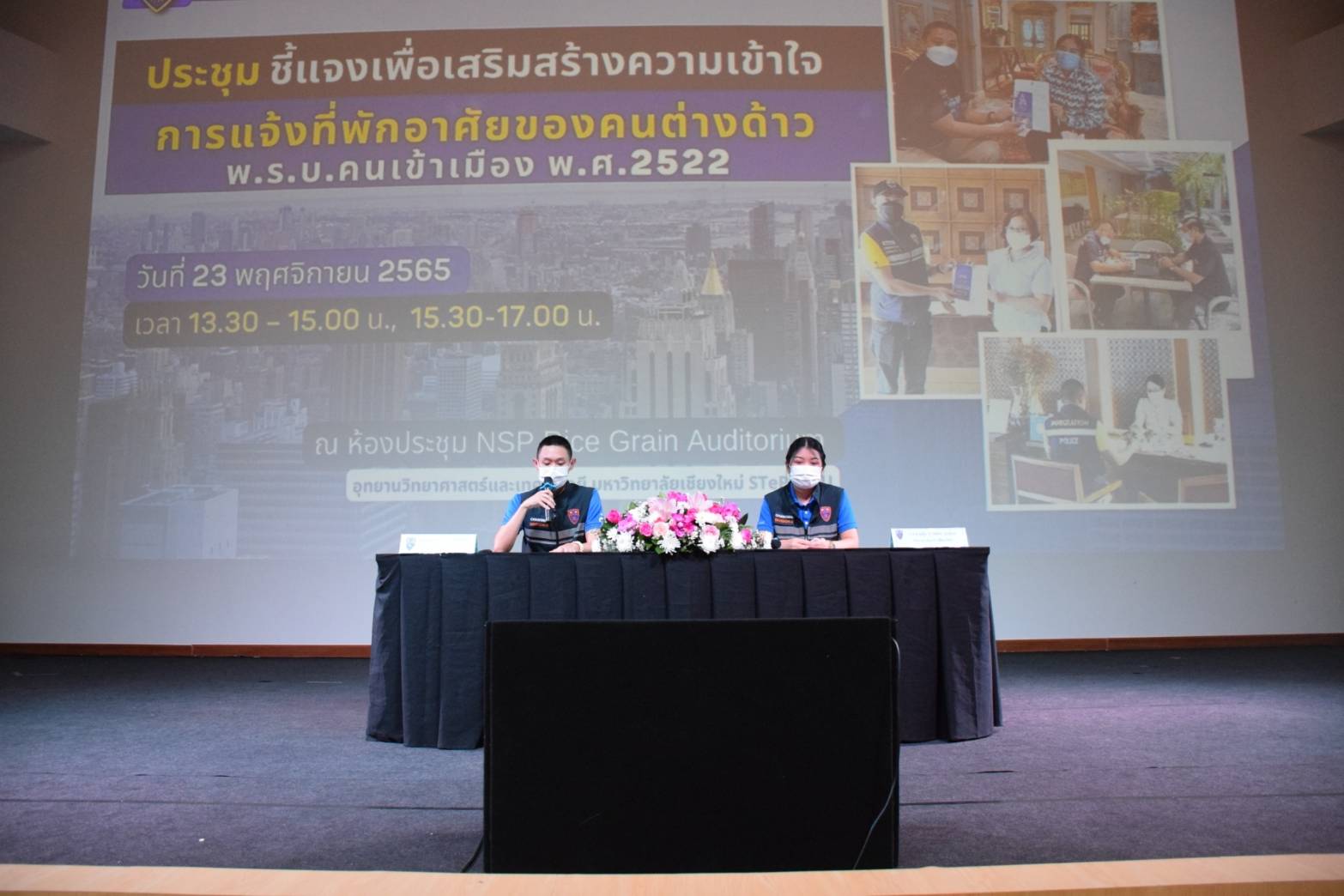 โดยในการจัดประชุมครั้งนี้ ได้มี พ.ต.อ.วีวัฒน์ นิลวัตร ผกก.ตม.จว.เชียงใหม่ , พ.ต.ท.หญิง พัสษลพร ศุกระศร รอง ผกก.ตม.จว.เชียงใหม่ รวมทั้งเจ้าหน้าที่ในสังกัด ได้จัดประชุมกับ สำนักงานพาณิชย์จังหวัดเชียงใหม่ และเจ้าบ้าน เจ้าของ หรือผู้ครอบครองเคหะสถาน หรือผู้จัดการโรงแรมซึ่งรับคนต่างด้าวเข้าพักอาศัย โดยจัดหัวข้อชี้แจงชื่อ “ความสำคัญของการแจ้งที่พักอาศัยของคนต่างด้าว และช่องทางการแจ้งที่พักอาศัย” โดยจัดขึ้นในวันพุธที่ 23 พ.ย.2565 ณ ห้องประชุม NSP RICE GRAIN AUDITORIUM อุทยานวิทยาศาสตร์และเทคโนโลยี มหาวิทยาลัยเชียงใหม่ (STeP CMU) จ.เชียงใหม่ โดยมีผู้เข้าร่วมประชุม ได้แก่ โรงแรมในพื้นที่รับผิดชอบ 805 แห่ง และ สำนักงานพาณิชย์จังหวัดเชียงใหม่ มาร่วมสังเกตการณ์