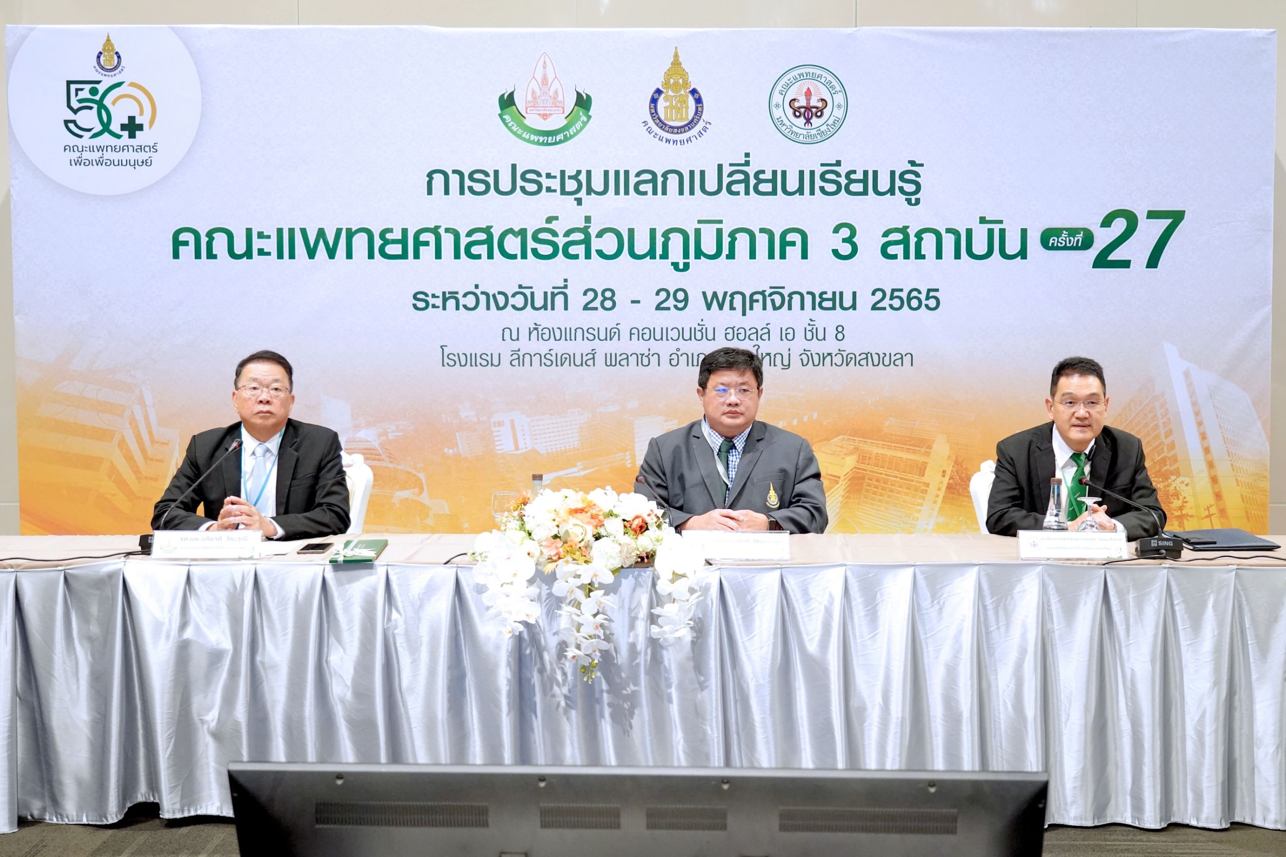 ศ.(เชี่ยวชาญพิเศษ) นพ.บรรณกิจ โลจนาภิวัฒน์ คณบดีคณะแพทยศาสตร์ มช. พร้อมคณะผู้บริหาร ร่วมประชุมแลกเปลี่ยนเรียนรู้ คณะแพทยศาสตร์ ส่วนภูมิภาค 3 สถาบัน ครั้งที่ 27 โดยมี รศ.นพ.เรืองศักดิ์ ลีธนาภรณ์ คณบดีคณะแพทยศาสตร์ มหาวิทยาลัยสงขลานครินทร์ , รศ.นพ.อภิชาติ จิระวุฒิพงศ์ คณบดีคณะแพทยศาสตร์ มหาวิทยาลัยขอนแก่น พร้อมคณะผู้บริหารคณะแพทยศาสตร์ จากทั้ง 3 สถาบัน ร่วมหารือแนวทางในด้านการวิจัยและนวัตกรรม , ด้านการศึกษา , ด้านบริหาร , และด้านบริการ/โรงพยาบาล พร้อมทั้งติดตาม/รายงานความก้าวหน้าในเรื่องที่เคยทำร่วมกันในด้านต่างๆ ระหว่างวันที่ 28-29 พฤศจิกายน 2565 ณ ห้องแกรนด์ คอนเวนชั่น ฮอลล์ เอ ชั้น 8 โรงแรม ลีการ์เดนส์ พลาซ่า อ.หาดใหญ่ จ.สงขลา