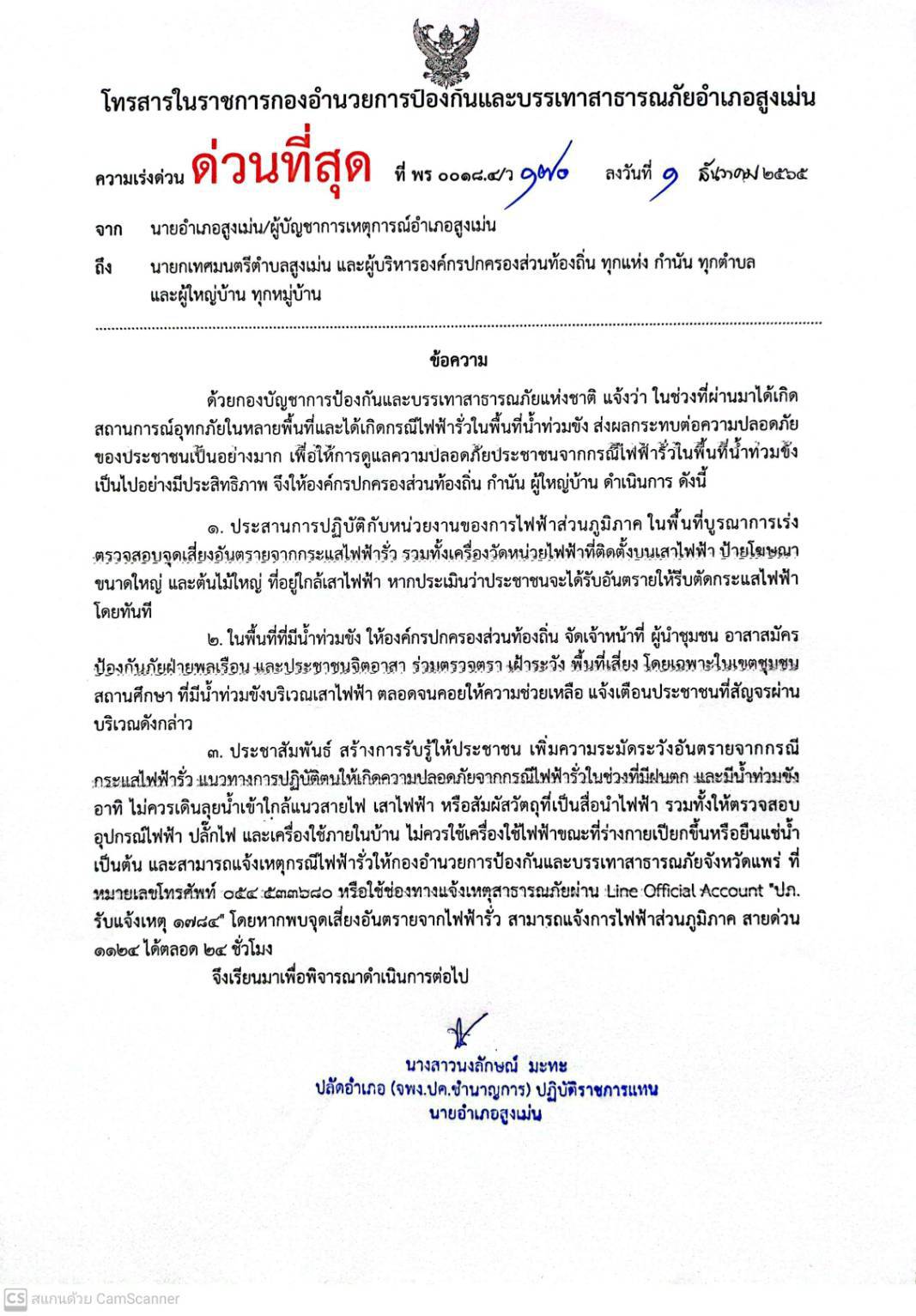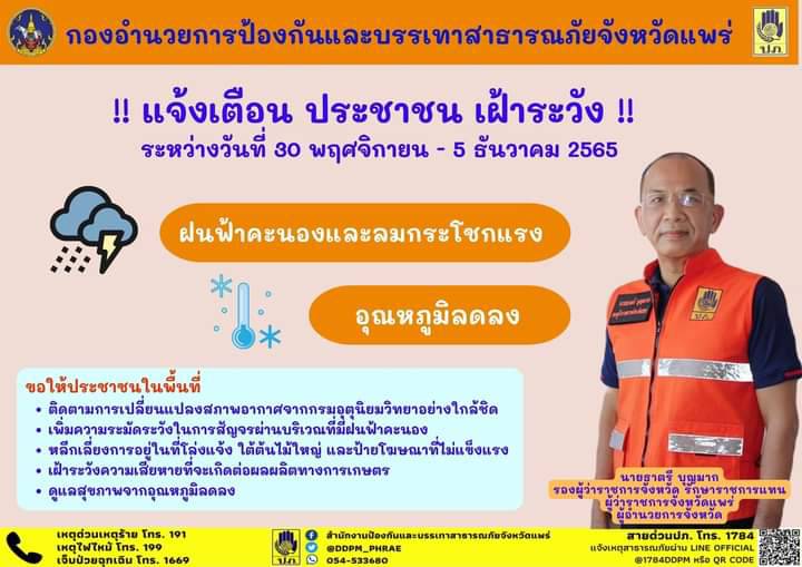 นายธาตรี บุญมาก รองผู้ว่าราชการจังหวัด รักษาราชการแทนผู้ว่าราชการจังหวัดแพร่ แจ้งเตือนประชาชนในพื้นที่จังหวัดแพร่ให้เฝ้าระวังอันตรายจากฝนฟ้าคะนองและลมกระโชกแรง ในช่วงวันที่ 30 พฤศจิกายน – 4 ธันวาคม 2565 เนื่องจากประเทศไทยตอนบนจะมีฝนฟ้าคะนองและฝนตกหนักบางพื้นที่ จึงขอให้ประชาชนติดตามการเปลี่ยนแปลงสภาพอากาศจาวกกรมอุตุนิยมวิทยาอย่างใกล้ชิด หลีกเลี่ยง การอยู่ในที่โล่งแจ้ง ใต้ต้นไม้ใหญ่ และป้ายโฆษณาที่ไม่แข็งแรง เพิ่มความระมัดระวังในการสัญจรผ่านบริเวณที่มีฝนฟ้าคะนอง รวมถึงเกษตรกรให้เฝ้าระวังความเสียหายที่จะเกิด ต่อผลผลิตทางการเกษตร พร้อมสั่งการกองอำนวยการป้องกันและบรรเทาสาธารณภัยอำเภอและหน่วยงานที่เกี่ยวข้องทำการประชาสัมพันธ์สร้างการรับรู้ให้กับประชาชน และเตรียมความพร้อมให้การช่วยเหลือกรณีประสบพิบัติภัย