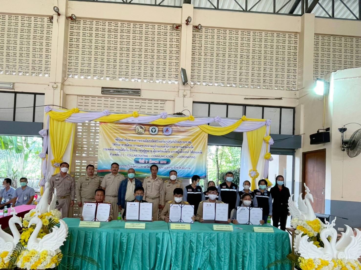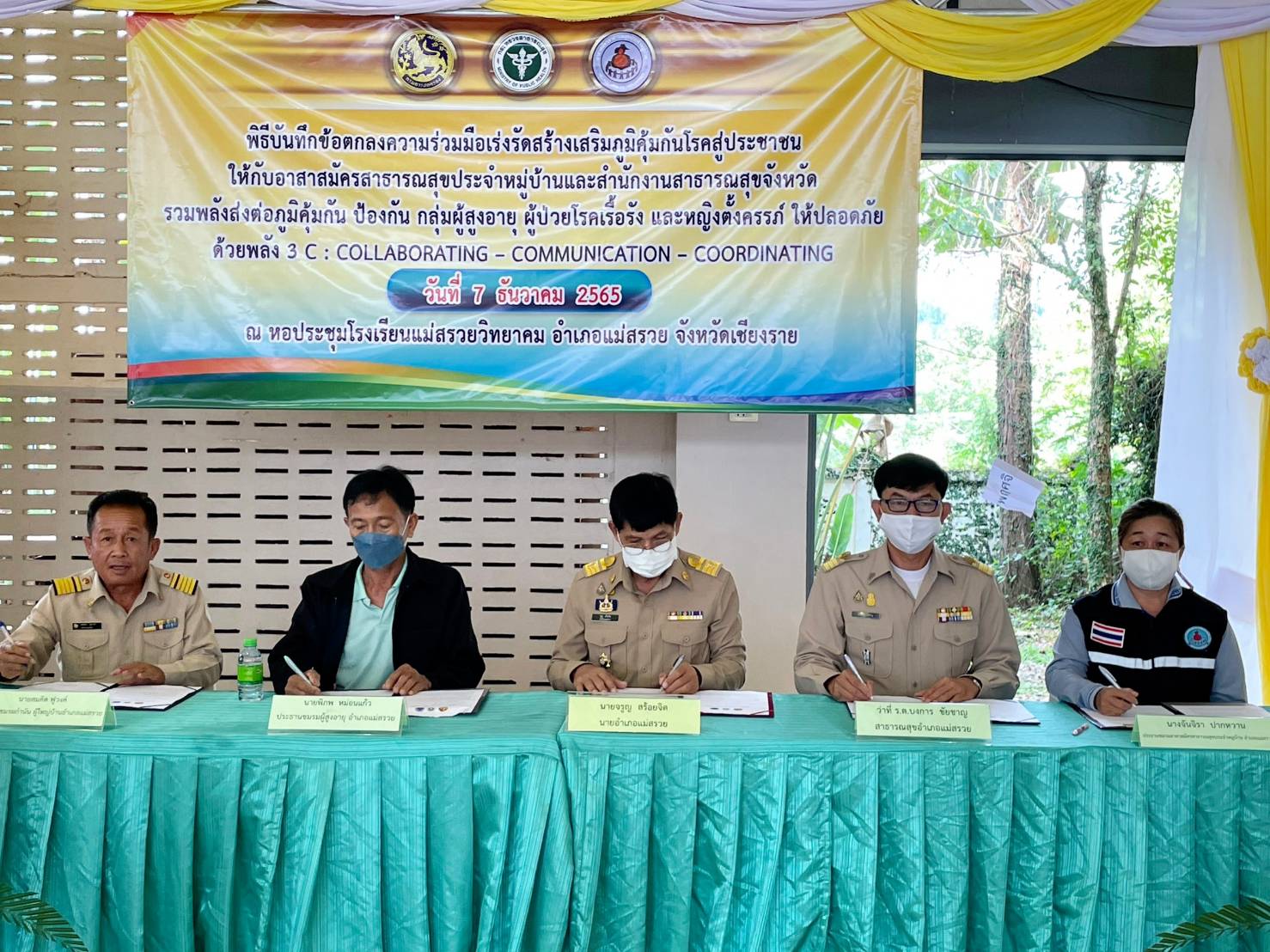 เมื่อวันที่ 7 ธันวาคม 2565 ณ ที่หอประชุมโรงเรียนแม่สรวยวิทยาคม อ.แม่สรวย จ.เชียงราย นายจรูญ สร้อยจิต นายอำเภอแม่สรวย ว่าที่ ร.ต.บงการ ชัยชาญ สสอ.แม่สรวย ร่วมกับ นายสมคิด ฟูวงค์ ประธานชมรมกำนัน ผู้ใหญ่บ้าน อ.แม่สรวย นายพิภพ หม่อนแก้ว ประธานชมรมผู้สูงอายุ อ.แม่สรวย และนางจันจิรา ปากหวานประธานชมรม อสม.อำเภอแม่สรวย ได้ร่วมลงนามบันทึกข้อตกลงความร่วมมือ(MOU) เร่งรัดสร้างเสริมภูมิคุ้มกันโรคสู่ประชาชน รวมพลังส่งต่อภูมิคุ้มกัน ป้องกันกลุ่มสูงอายุ ผู้ป่วยโรคเรื้อรัง และหญิงตั้งครรภ์ให้ปลอดภัย ด้วยพลัง 3 C เพื่อยังผลให้เกิดความร่วมมือร่วมใจ การสื่อสารกว้างไกล และการประสานรอบด้าน ให้ประชาชนกลุ่มเป้าหมายในอำเภอแม่สรวย ได้รับวัคซีนป้องกัน ซึ่งเป็นการลดความรุนแรงของการเจ็บป่วย และลดการเสียชีวิตด้วยโควิด -19 โดยมี กำนัน ทุกตำบล และประธาน อสม.ตำบล ในอำเภอแม่สรวย ร่วมเป็นสักขีพยานในการลงนาม