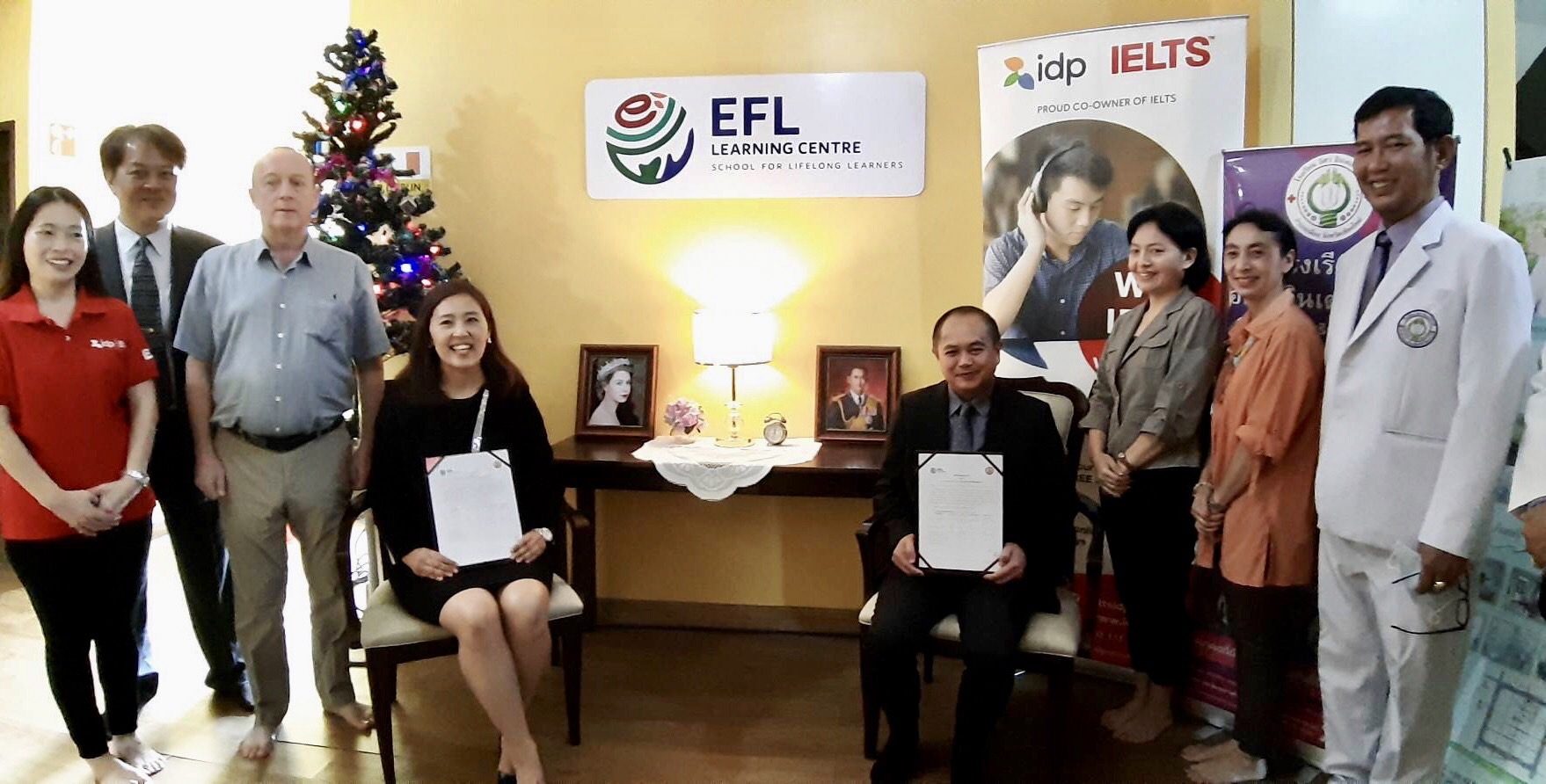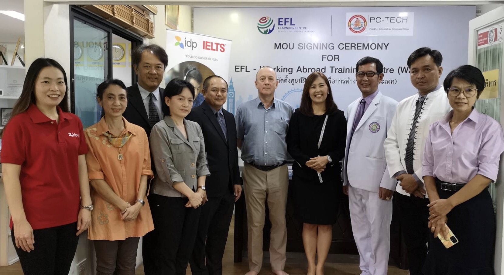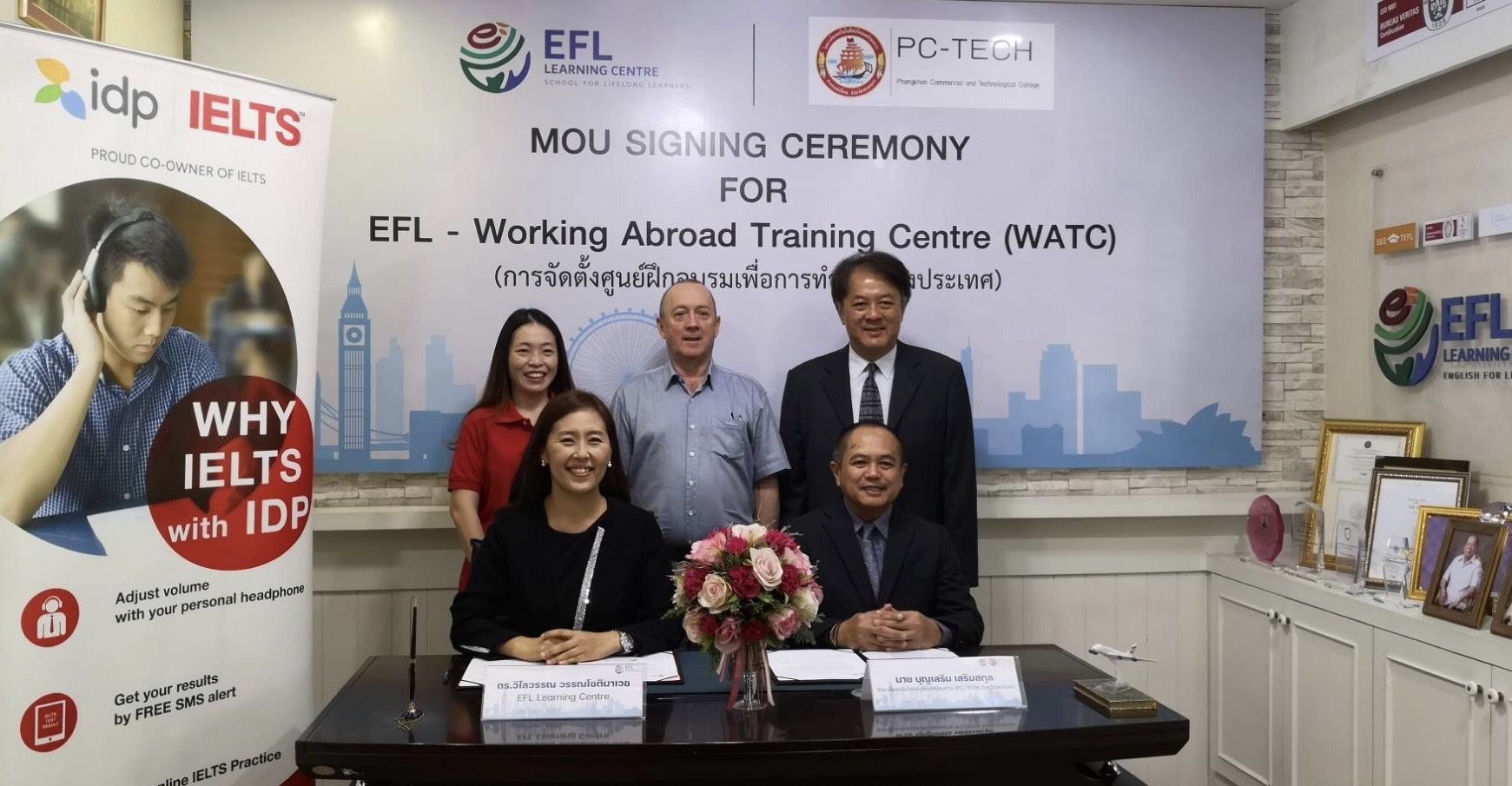 วันที่ 15 ธันวาคม 2565 เวลา 11.00 น. EFL Learning Centre สถาบันภาษาแรกในเอเชียที่ได้รับการรับรองมาตรฐาน ISO 9001 และ หลักสูตรได้รับการรับรองจากกระทรวงศึกษาธิการ และ Training Qualifications UK สหราชอาณาจักร โดย Mr. John Quinn ผู้สอบ IELTS Examiner (License No.97130) ของ University of Cambridge ESOL เป็นการทดสอบภาษาอังกฤษระดับนานาชาติ (International English Language Testing System: IELTS) และ ดร.วิไลวรรณ วรรณโชติผาเวช ผู้บริหาร EFL Learning Centre ลงนาม บันทึกข้อตกลงความเข้าใจ (MOU) จัดตั้ง “ศูนย์ฝึกอบรมเพื่อการทำงานต่างประเทศ EFL – Working Abroad Training Centre (WATC)” ร่วมกับ 3 องค์กร ได้แก่1. วิทยาลัยเทคโนโลยีพังโคนพณิชยการ (PC-TECH) จังหวัดสกลนคร โดย นาย บุญเสริม เสริมสกุล ประธานบริหารวิทยาลัย 2. พิมาน ล้านนา โดยนางประณยา สีห์พิริโยดม ผู้จัดการ พิมานล้านนา 3.อิศวอินเตอร์ไลฟ์ โรงเรียนบริบาลสังกัดสำนักงานคณะกรรมการส่งเสริมการศึกษาเอกชน เป็นตัวแทนในการลงนาม ในการนี้ได้รับเกียรติจาก นางสาว ภารดี ตั้งตระกูล IELTS Business Development Officer, Northern Thailand ตัวแทนจาก IDP IELTS ซึ่งเป็นเจ้าของข้อสอบร่วม IELTS (IELTS Co-owner) เข้าเป็นสักขีพยาน ทั้งนี้ศูนย์ EFL-WATC มุ่งเน้นที่จะ Upskill ภาษาอังกฤษเพื่อส่งเสริมนักเรียนที่มีความพร้อมที่จะทำงานในระดับนานาชาติต่อไป