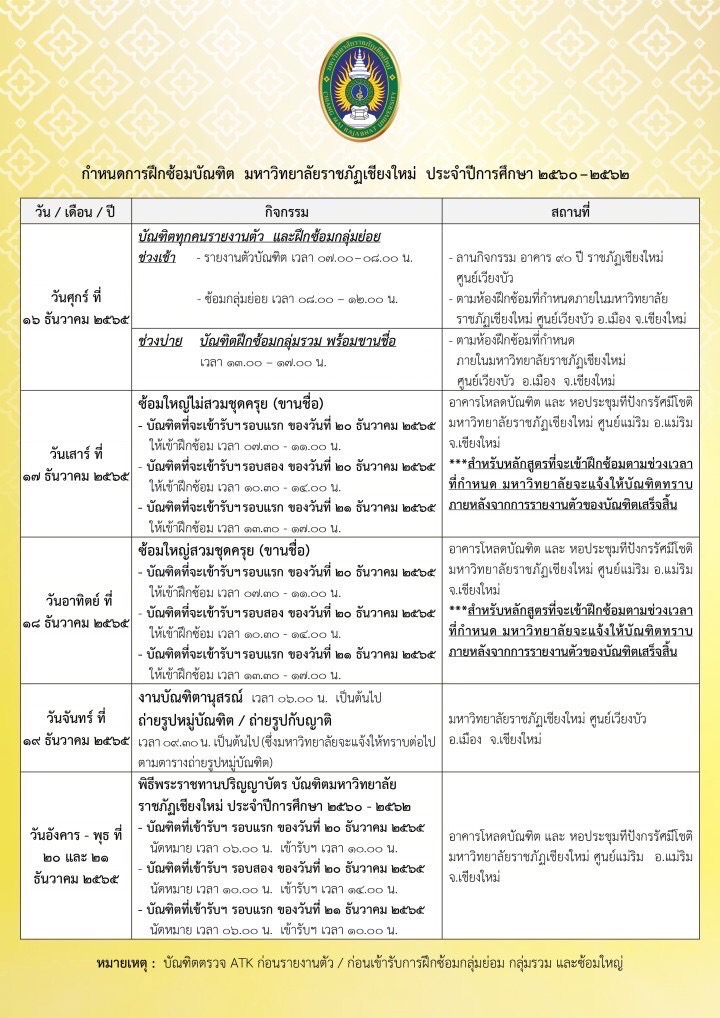 จราจรเชียงใหม่ ประชาสัมพันธ์เป็นข้อมูลในการวางแผนการเดินทาง การซักซ้อมพิธีพระราชทานปริญญาบัตรมหาวิทยาลัยราชภัฏเชียงใหม่ วันที่ 16 และ19 ธันวาคม 2565 มหาวิทยาลัยราชภัฏเชียงใหม่ ศูนย์เวียงบัวจังหวัดเชียงใหม่