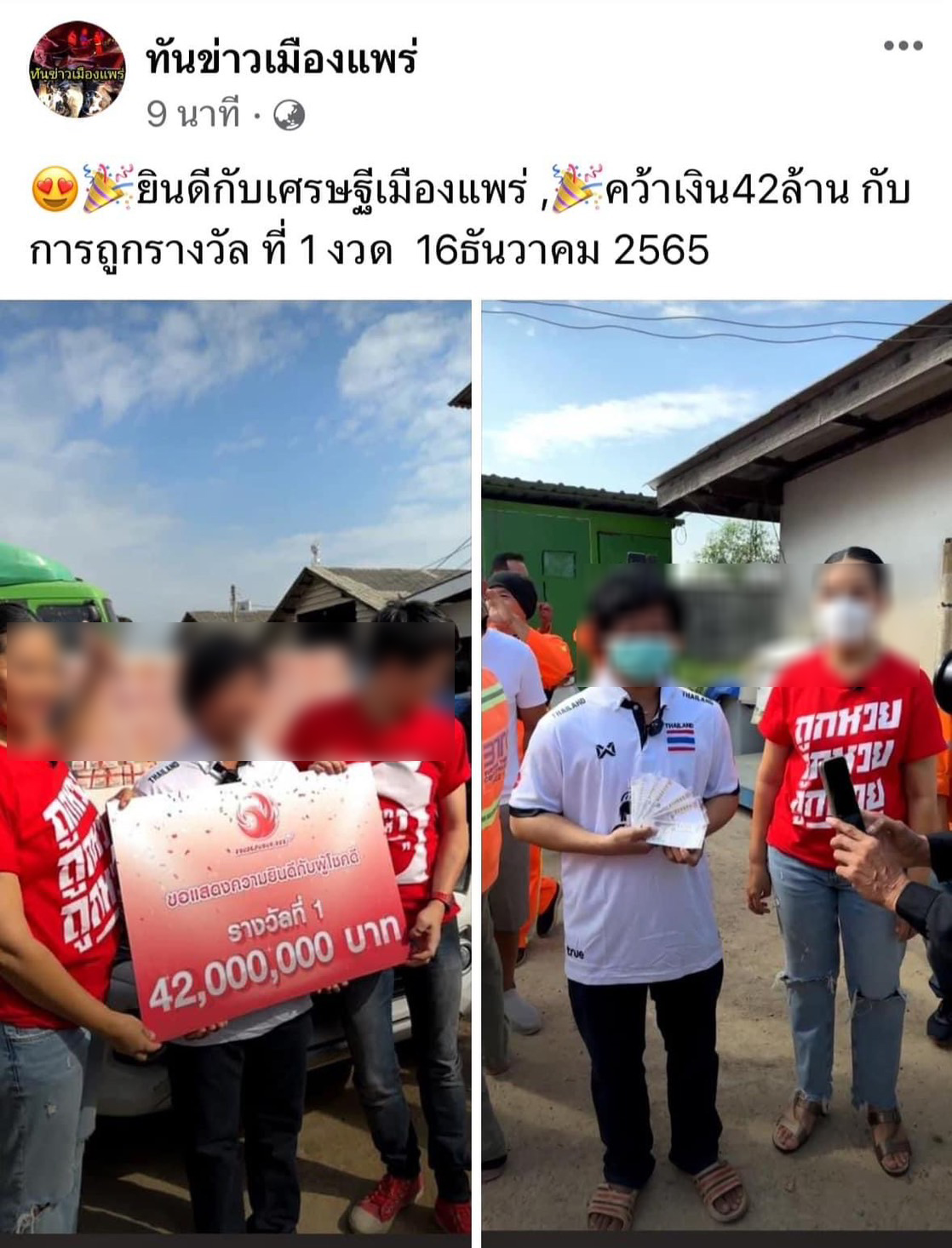 ผู้สื่อข่าวรายงานจาก จ.แพร่ ตลอดทั้งวันของวันที่ 17 ธันวาคม 2565 ในโลกโชเชียล จ.แพร่ ทั่วกลุ่มไลน์ เฟชบุ๊ก ต่างก็ยินดีคนแพร่ที่ไปทำงานอยู่ที่ จ.ชลบุรี ถูกรางวัลที่ 1จำนวน 7 ใบ จำนวนเงิน 42 ล้านบาท เช่นเพจทันข่าวเมืองแพร่ โพสต์ว่า ยินดีกับเศรษฐีเมืองแพร่ น้องกาย หนุ่ม ต.กาญจนา อ.เมืองแพร่ คว้าเงิน 42 ล้าน กับการถูกรางวัล ที่ 1 งวด 16 ธันวาคม 2565 สำหรับบ้านผู่โชคดีรายนี้ อยู่ที่หน้าวัดหนองบ่อต.กาญจนา อ.เมือง จ.แพร่ ได้ปิดบ้านไว้ไปทำงานอยู่ที่ จ.ชลบุรี คาดว่าอีกไม่นานคงจะกลับมาอยู่บ้าน