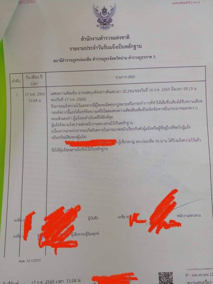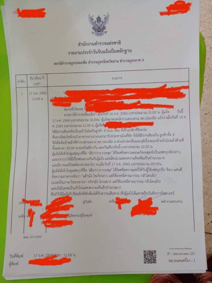 ในเวลาประมาน 00.30 น. ทางเราก็ได้เข้าไปดูโพสของลูกค้าอีกรอบ ซึ่งก็มีการนำคลิปและภาพเดิมที่เคยโพสครั้งแรก นำมาโพสอีกรอบ และมีการแชร์และคอมเม้นกันมากมายๆ ด้วยถ้วยคำเสียๆหายๆ ซึ่งหนึ่งในนั้นคือ ลูกค้าได้เข้ามาตอบคอมเม้นคนที่มาคอมเม้นว่า “… จริงๆมึงโกรธมาก แต่ต้องหนีตายออกมาก่อน กลัวโดนยิง…” ซึ่งอ่านดูแล้ว มันไม่ยุติธรรมกับทางคนที่ดูแลที่พักและทางที่พัก จึงได้เดินทางมาแจ้งความไว้ที่ สภ.บ่อเกลือ เพื่อหวังให้มาเจรจาที่โรงพัก โดยเจ้าหน้าที่ตำรวจได้โทรไปหาลูกค้า เรียกเข้ามาเจรจาไกล่เกลี่ยกันก่อนรับแจ้งความ แต่กลับโดยลูกค้าต่อว่า ด้วยถ้อยคำไม่สุภาพ. แล้ววางสายไป ตำรวจจึงรับแจ้งความเป็นคดีไว้