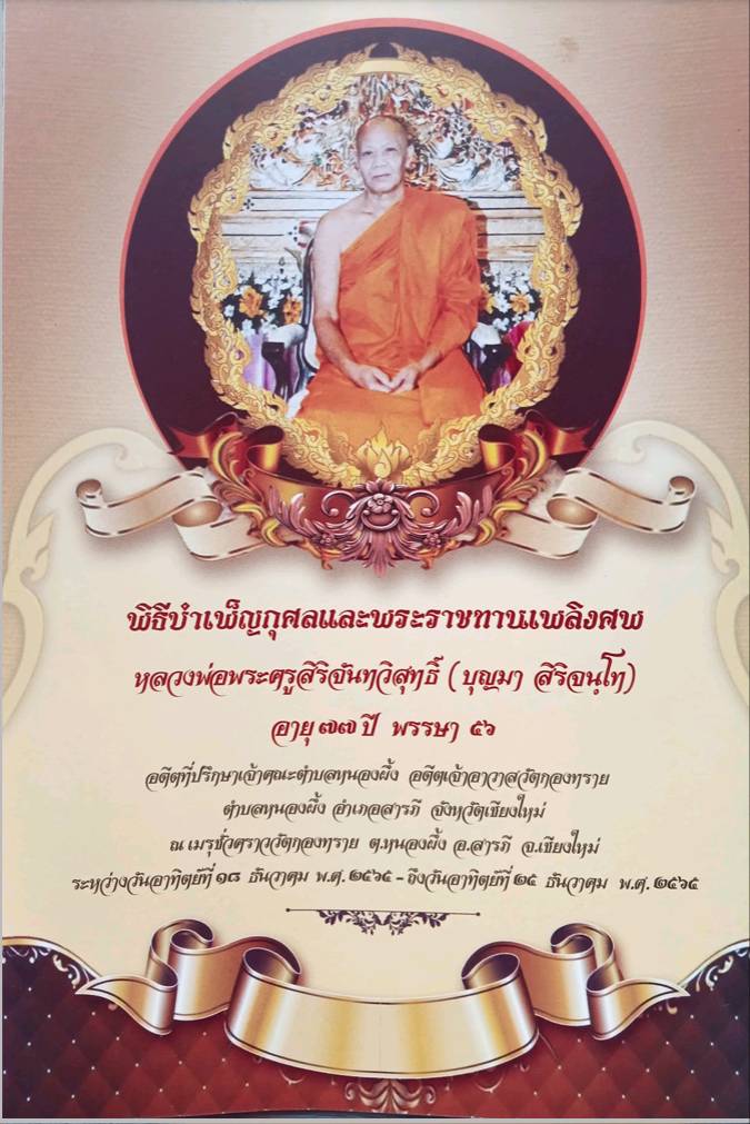 ศิษยานุศิษย์ ได้ประกอบพิธีอัญเชิญร่างท่านพระครูสิริจันท์วิสุทธิ์(บุญมา สิริจนุโท) อดีตที่ปรึกษาเจ้าคณะตำบลหนองผึ้ง อดีตเจ้าอาวาสวัดกองทราย อายุ 79 ปีพรรษา 59 อัญเชิญขึ้นสู่ประสาทแก้ว วิมานนกหัสดีลิงค์ ณ เมรุชั่วคราว วัดกองทรายตำบลหนองผึ้ง อำเภอสารภี จังหวัดเชียงใหม่ ตั้งแต่วันที่ 18 ธันวาคม-25 ธันวาคม 2565 สำหรับวันที่ 25 จะได้ทำพิธีพระราชทานเพลิงศพ ณ เมรุชั่วคราววัดกองทราย