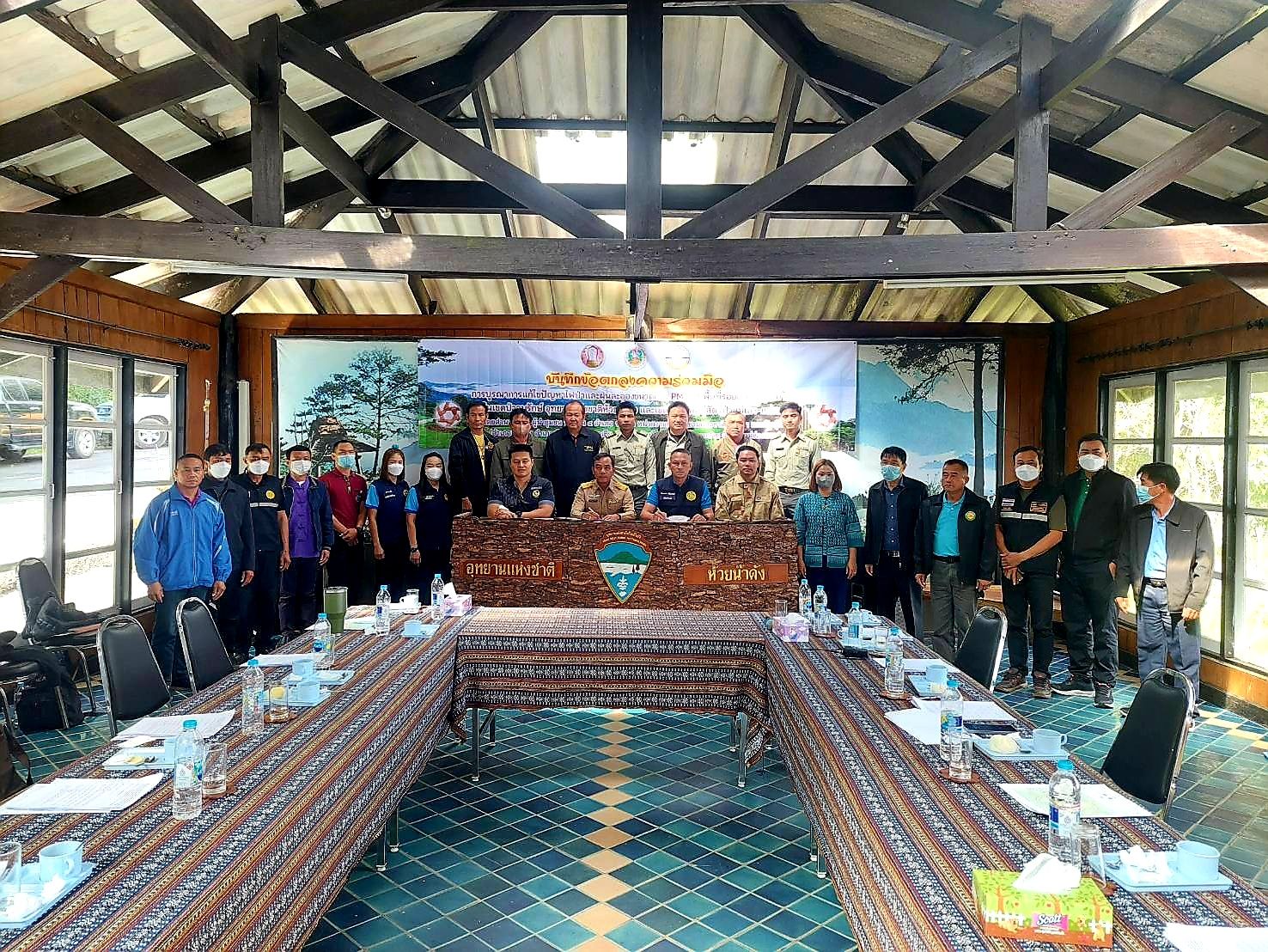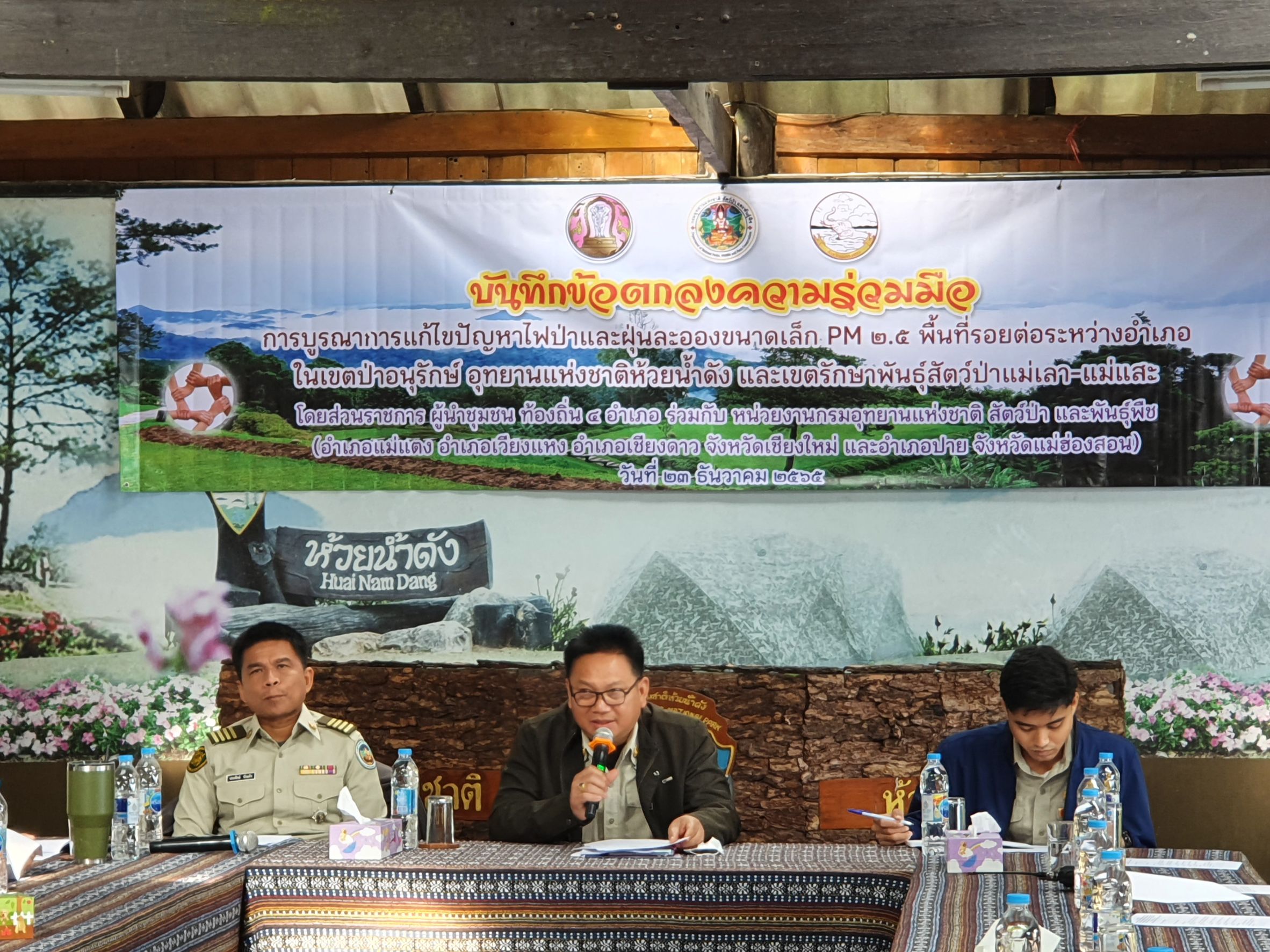 วันที่ 23 ธ.ค2565 ที่ห้องประชุมสายหมอก อุทยานแห่งชาติห้วยน้ำดัง นายชัยณรงค์ นันตาสาย นายอำเภอแม่แตง ได้มอบหมายให้ นายโชคทวี ศรีเที่ยง ปลัดอำเภอ ร่วมประชุมเพื่อทำบันทึกข้อตกลงความร่วมมือการบูรณาการ ( MOU ) การแก้ไขปัญหาไฟป่าและฝุ่นละอองขนาดเล็ก PM2.5 พื้นที่รอยต่อระหว่างอำเภอ และพื้นที่รอยต่อระหว่างจังหวัด ในเขตป่าอนุรักษ์ อุทยานแห่งชาติห้วยน้ำดัง และเขตรักษาพันธุ์สัตว์ป่าแม่เลา-แม่แสะ โดยหน่วยงานกรมอุทยานแห่งชาติ สัตว์ป่า และพันธุ์พืช ส่วนราชการ ผู้นำชุมชน ท้องถิ่น 4 อำเภอ 2 จังหวัด ได้แก่อำเภอแม่แตง อำเภอเวียงแหง อำเภอเชียงดาว จังหวัดเชียงใหม่ และอำเภอปาย จังหวัดแม่ฮ่องสอน