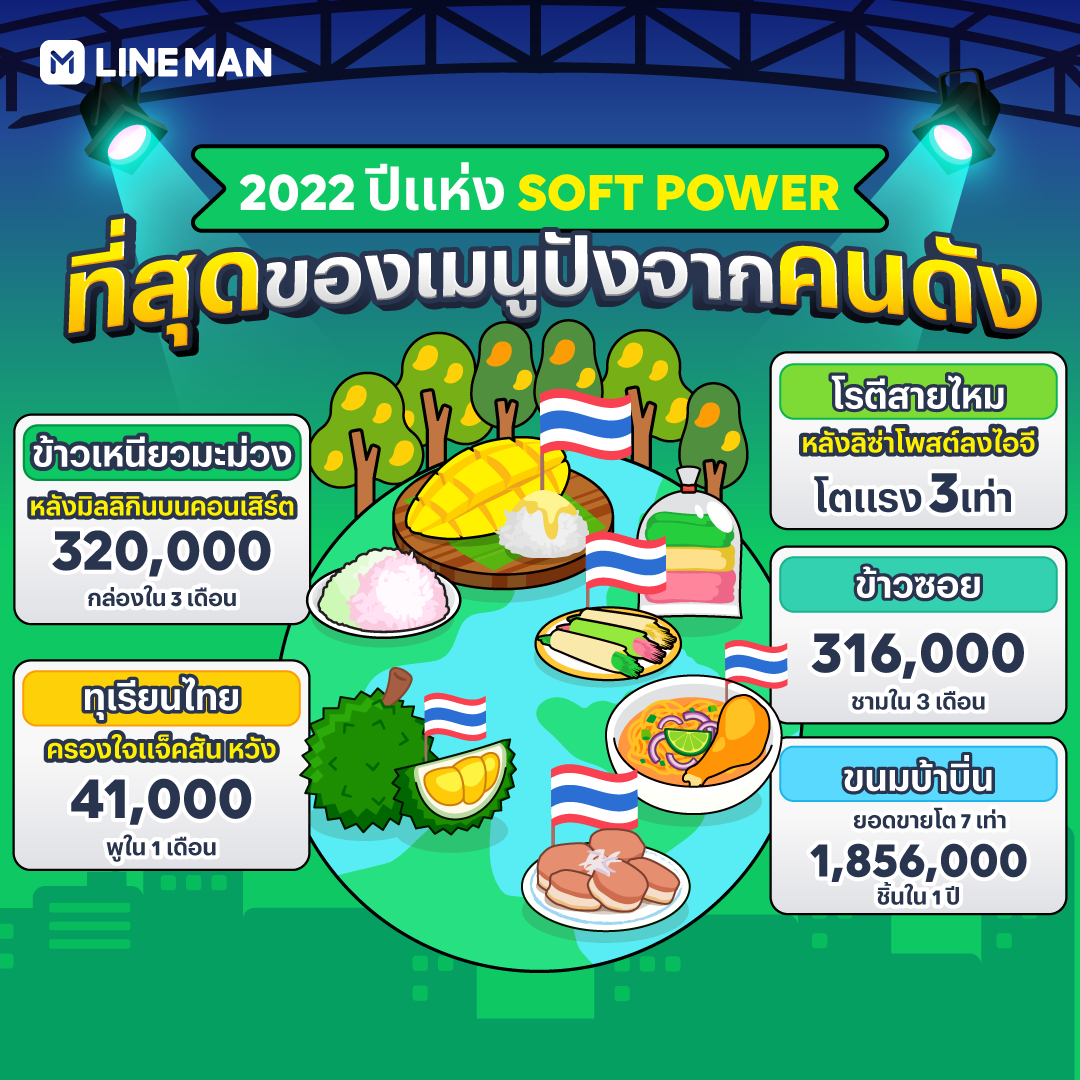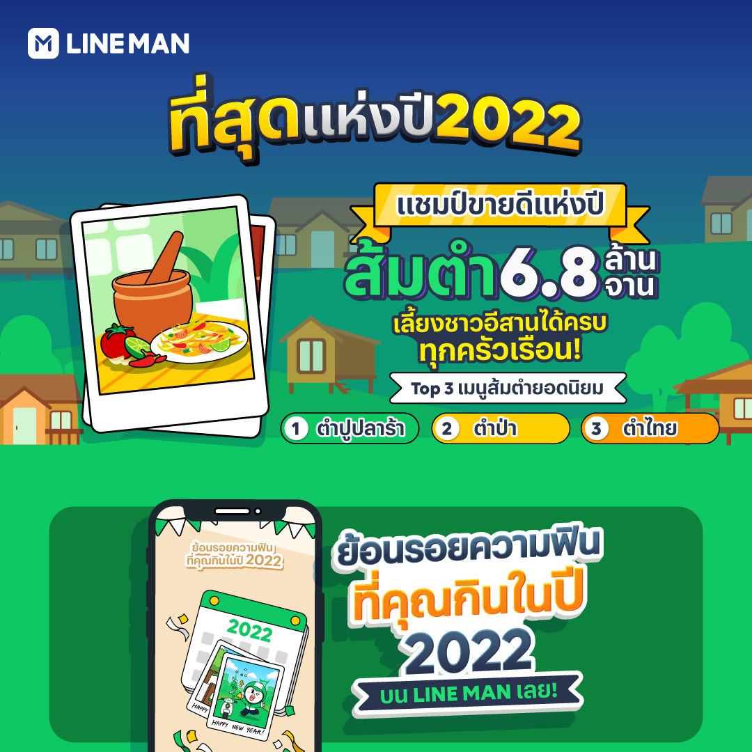 LINE MAN รวบรวมสถิติ “ที่สุดแห่งปี 2022” เผยเทรนด์การกินของคนไทยกว่า 10 ล้านคน ทั้ง 77 จังหวัด ที่สั่งจากร้านอาหารกว่า 7 แสนร้าน ตลอดทั้งปี พบปรากฏการณ์พลังคนดังรันวงการอาหารไทยแจ้งเกิดเมนูขวัญใจคนไทยชั่วข้ามคืน ปีแห่ง Soft Power ปรากฏการณ์พลังคนดังปลุกเมนูฮิต “ข้าวเหนียวมะม่วง โรตีสายไหม ข้าวซอย ทุเรียน และขนมบ้าบิ่น” ยอดพลุแตกชั่วข้ามคืน อีกทั้งค้นพบว่า “ส้มตำ” เมนูขวัญใจคนไทยปี 2022 มียอดสั่งสูงที่สุดบน LINE MAN ทะลุ 6.8 ล้านจาน พร้อมเผยสถิติที่น่าสนใจในทุกบริการบน LINE MAN ย้ำภาพผู้นำ On-demand Platform ของคนไทย