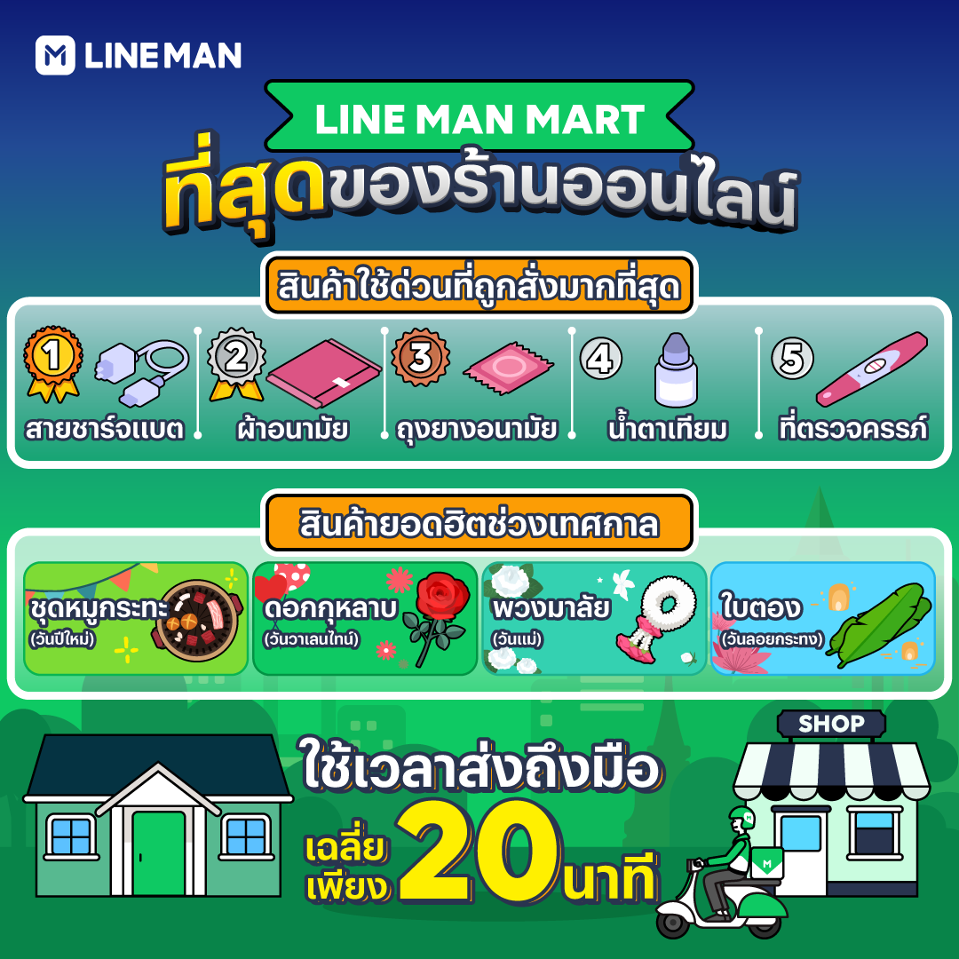 Quick Commerce Trend ค่อย ๆ เข้ามาเปลี่ยนพฤติกรรมผู้บริโภคในการสั่งของสด-ของใช้จากร้านออนไลน์มากขึ้น ไม่ต้องเสียเวลาเดินออกไปซื้อด้วยตัวเอง ปัจจุบัน LINE MAN MART มีร้านค้ารายย่อยหลากหลายประเภทสินค้าบนแพลตฟอร์มมากกว่า 60,000 ร้าน และใช้เวลาเฉลี่ยในการจัดส่งเพียง 20 นาทีตอบรับความต้องการของผู้ใช้ที่ต้องการสินค้าทันที ในปีนี้ LINE MAN MART พบสถิติที่น่าสนใจจากสินค้าที่คนไทยมักลืมหรือสินค้าที่ต้องการใช้ด่วน 5 อันดับ ที่มียอดสั่งสูงที่สุด ได้แก่ สายชาร์จแบตโทรศัพท์, ผ้าอนามัย, ถุงยางอนามัย, น้ำตาเทียม และที่ตรวจครรภ์ ตามลำดับ