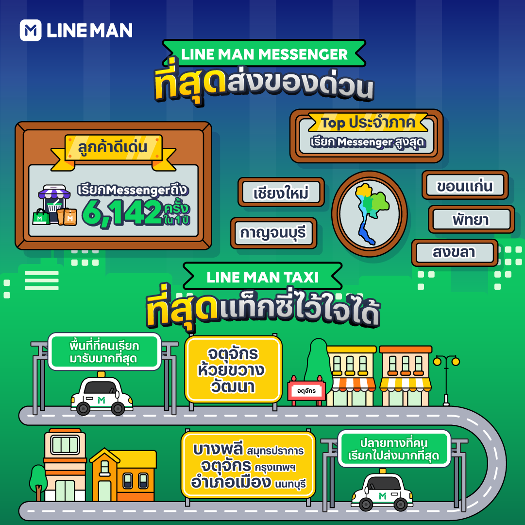 ปีนี้เป็นอีกหนึ่งก้าวสำคัญของบริการ LINE MAN MESSENGER ส่งของด่วน ส่งเอกสาร วางบิล ที่ขยายพื้นที่ให้บริการครอบคลุมทั้ง 77 จังหวัดทั่วประเทศเรียบร้อยแล้ว และได้รับกระแสตอบรับที่ดีในพื้นที่ต่างจังหวัดที่มีแนวโน้มการใช้งานเติบโตต่อเนื่อง สำหรับพื้นที่ต่างจังหวัดที่มีการใช้งาน Messenger สูงสุดประจำแต่ละภาค ได้แก่ พัทยา, เชียงใหม่, สงขลา, กาญจนบุรี และขอนแก่น