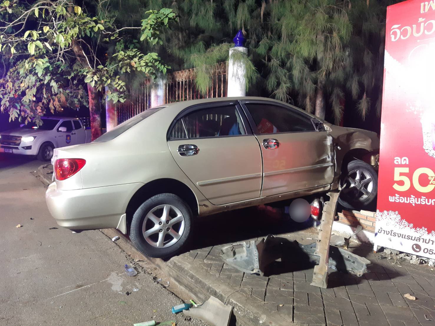 ในที่เกิดเหตุพบรถยนต์เก๋งยี่ห้อโตโยต้า อัสติส สีบรอนซ์ทอง ทะเบียนลำปาง พุ่งขึ้นฟุตบาททะลุเข้าไปในรั้วโรงเรียนเกือบครึ่งคัน โดยที่ใต้ท้องรถมีรถจักรยานยนต์ทะเบียนลำปาง ถูกทับอยู่ และผู้ขับขี่รถจักรยานยนต์ได้รับบาดเจ็บ เป็นชาย 1 ราย นอนอยู่บนฟุตบาท สภาพขาหักทั้งสองข้าง มีแผลถลอกตามร่างกาย ยังรู้สึกตัวดี เจ้าหน้าที่กู้ภัยจึงได้ปฐมพยาบาล และนำส่งรักษาที่โรงพยาบาลลำปางทันที ทราบชื่อต่อมาคือ นายศรศักดิ์ อายุ 21 ปี เป็นชาว อ.ปาย จ.แม่ฮ่องสอน