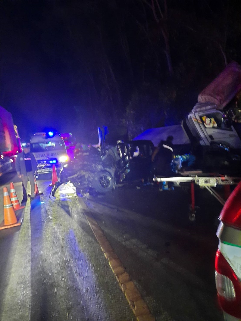 กระบะเฉี่ยวชนบรรทุกเทรลเลอร์ พบมีทั้งคนเจ็บและเสียชีวิตคาที่