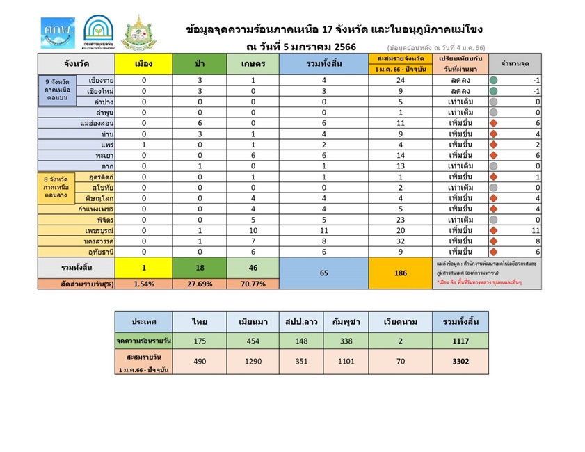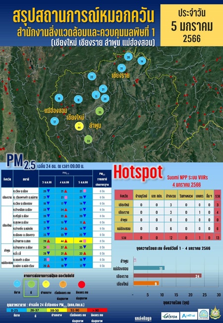 สรุปสถานการณ์ฝุ่น PM2.5 ประจำวันที่ 5 มกราคม 2566 ในพื้นที่รับผิดชอบของสำนักงานสิ่งแวดล้อมและควบคุมมลพิษที่ 1 (เชียงใหม่ เชียงราย ลำพูน แม่ฮ่องสอน)