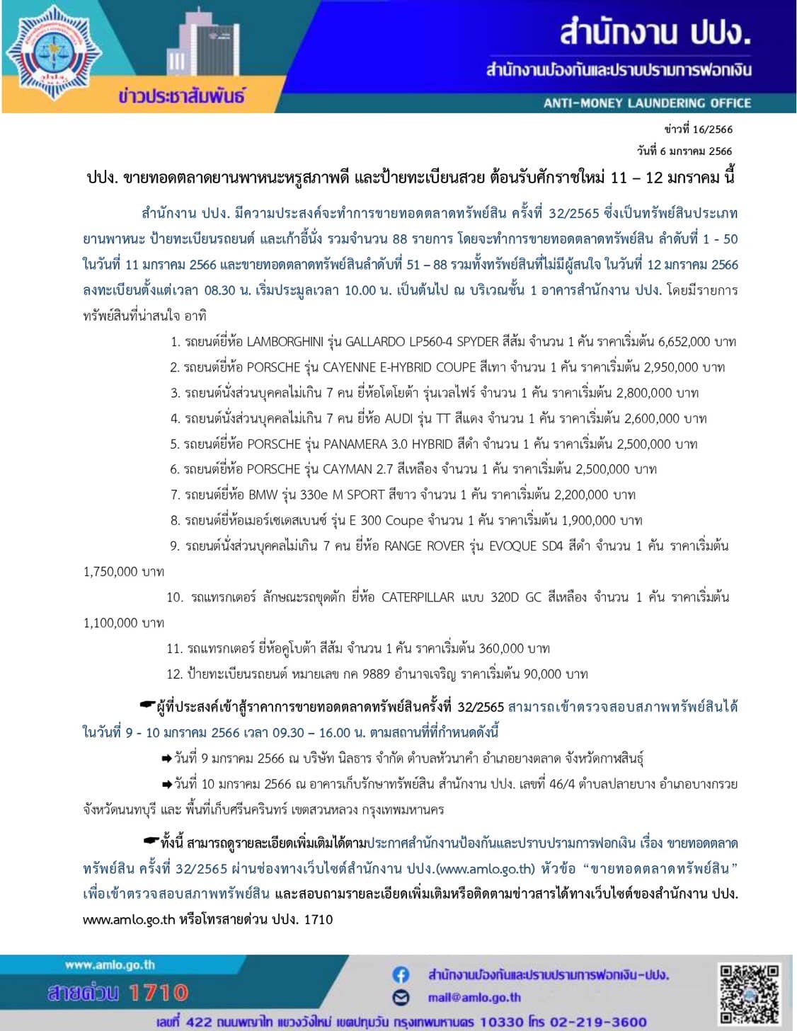 วันที่ 6 ม.ค.2566 สำนักงานคณะกรรมการป้องกันและปราบปรามการฟอกเงิน (ปปง.) มีความประสงค์จะทำการขายทอดตลาดทรัพย์สิน ครั้งที่ 32/2565 ซึ่งเป็นทรัพย์สินประเภทยานพาหนะ ป้ายทะเบียนรถยนต์ และเก้าอี้นั่ง รวมจำนวน 88 รายการ วันที่ 6 ม.ค.2566 สำนักงานคณะกรรมการป้องกันและปราบปรามการฟอกเงิน (ปปง.) มีความประสงค์จะทำการขายทอดตลาดทรัพย์สิน ครั้งที่ 32/2565 ซึ่งเป็นทรัพย์สินประเภทยานพาหนะ ป้ายทะเบียนรถยนต์ และเก้าอี้นั่ง รวมจำนวน 88 รายการ