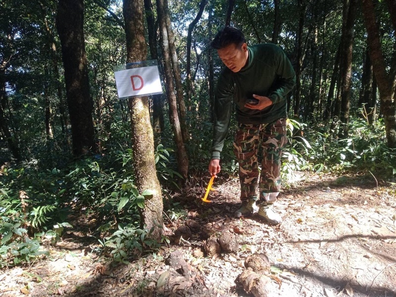 จุดที่ 1: พบเมื่อเวลา 19.40 น. บริเวณจุดเริ่มเดินเส้นทางบ้านห้วยปูลิง โดยปรากฏการพบเห็นตัวโดยตรง รอยเท้า และกองมูล