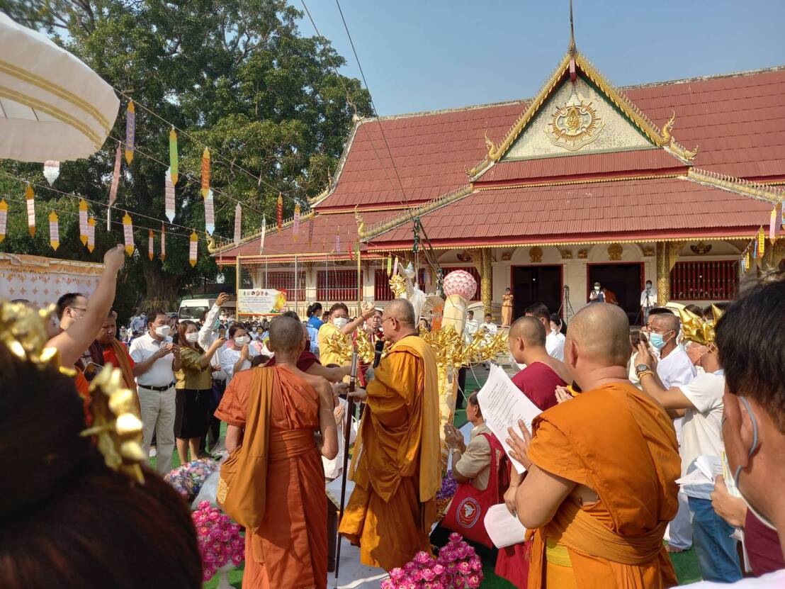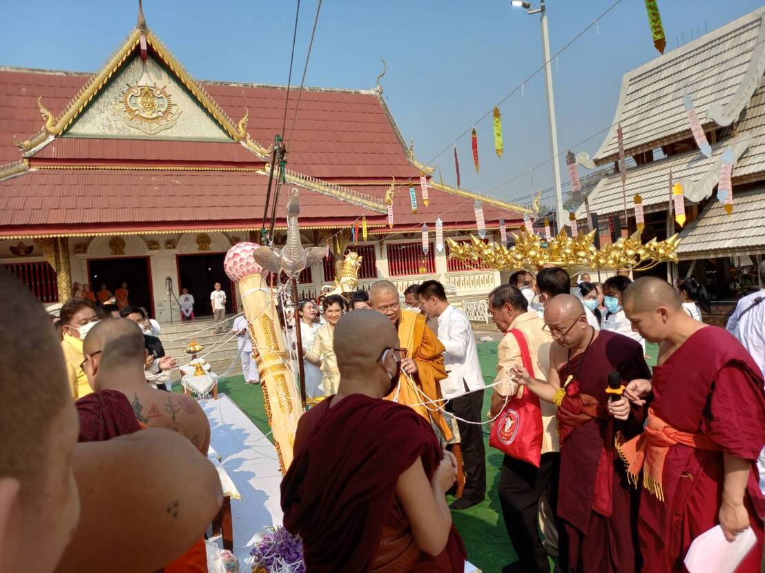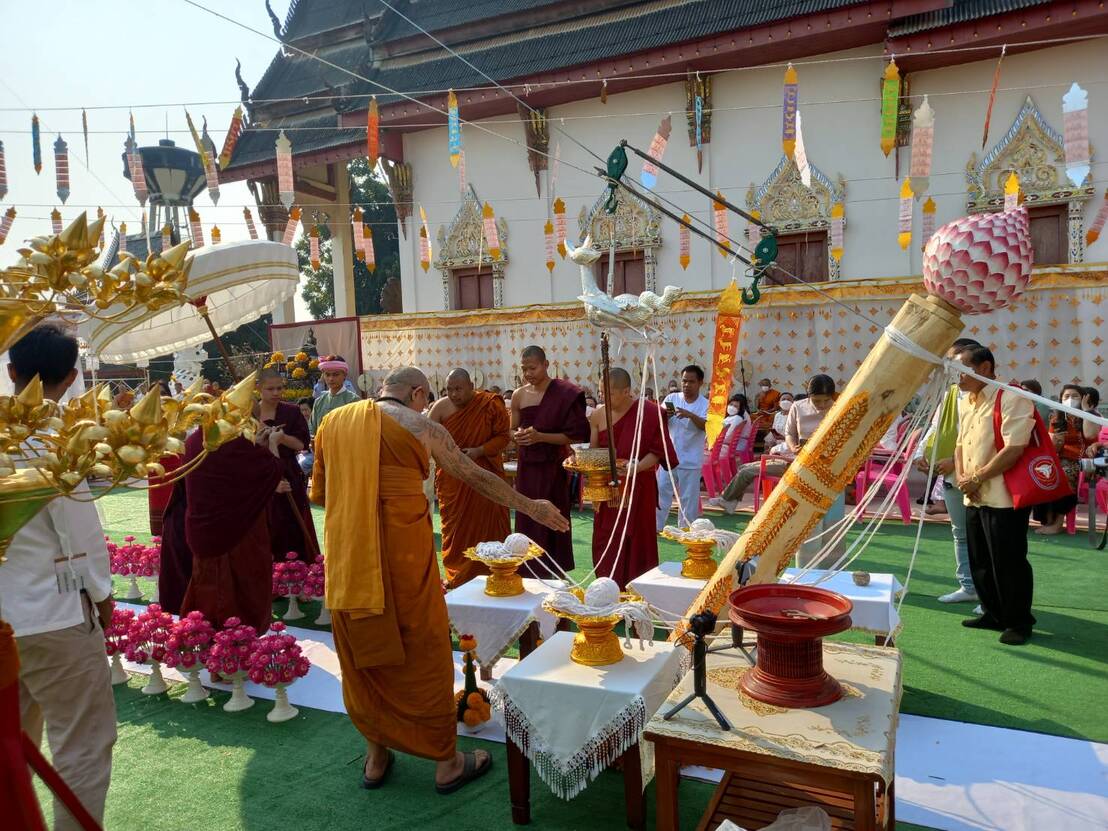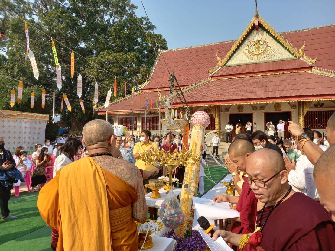 พุทธศาสนิกชนแน่นวัดปงท่าข้ามร่วมประกอบพิธีขลังและศักดิ์สิทธิ์ยกยอดฉัตรเจดีย์ศรีม่วงก้ำ 9 ชั้น