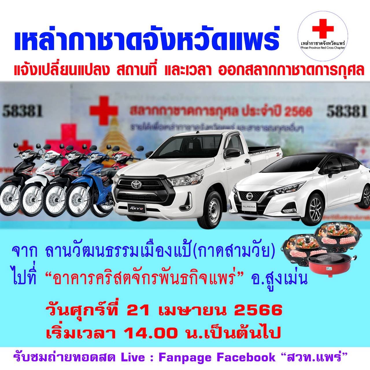เหล่ากาชาดจังหวัดแพร่ ห่วงสภาพอากาศร้อนจัด เสี่ยงเป็นฮีทสโตรก แจ้งขอเปลี่ยนสถานที่ และ เวลา ออกรางวัลสลากกาชาดการกุศล ประจำปี 2566 ในวันศุกร์ที่ 21 เมษายน 2566 จากที่ลานวัฒนธรรมเมืองแป้ (กาดสามวัย) ย้ายไปที่ “อาคารคริสตจักรพันธกิจแพร่” ตำบลร่องกาศ อำเภอสูงเม่น เริ่มเวลา 14.00 น. เป็นต้นไป