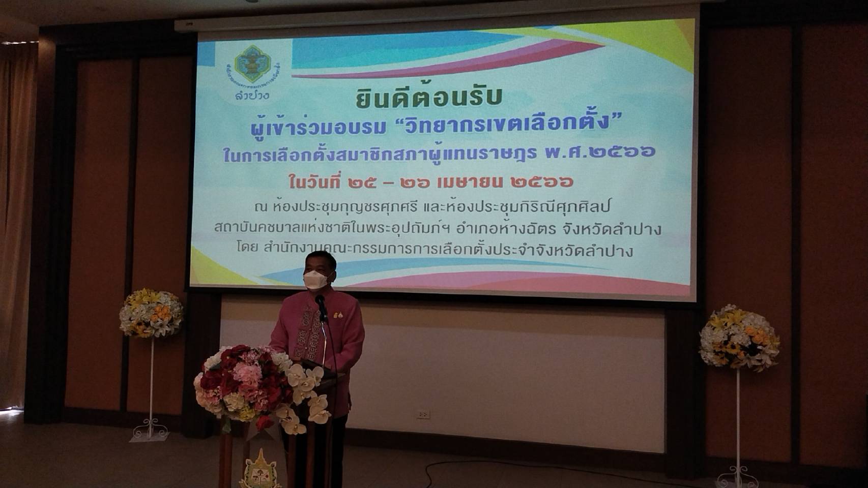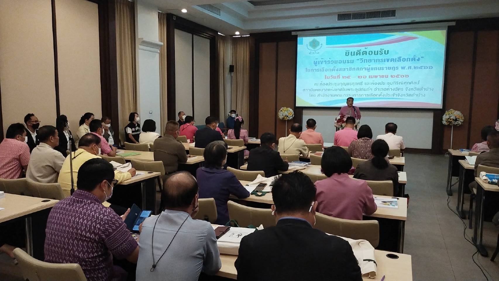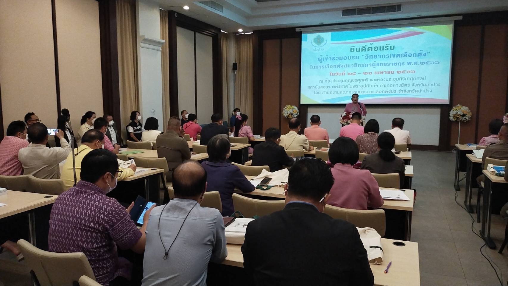 โดยมี นายฐิติวัฒน์ สุดเจริญ รอง ผอ.กกต.จ.ลำปางกล่าวรายงาน และวัตถุประสงค์การจัดฝึกอบรม ช่วง25-26 เมษายน2566 รวม2วัน ผู้เข้าอบรม110,คน ประกอบด้วย ประธาน กกต และ ผอ.กกต.ประจำเขต พร้อมคณะกรรมการฯเลือกตั้งเขต1-4 อนุกรรมการการเลือกตั้ง ประจำอำเภอ และผู้ประสานงานประจำเขตเลือกตั้ง