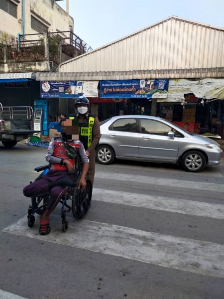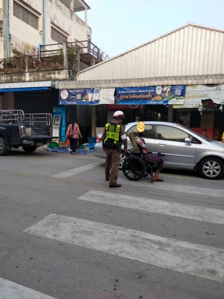 เจ้าหน้าที่ตำรวจ สภ.พร้าว จ.เชียงใหม่ อำนวยความสะดวกให้กับประชาชน นั่งรถเข็นให้ข้ามถนนบนทางม้าลายด้วยความปลอดภัย