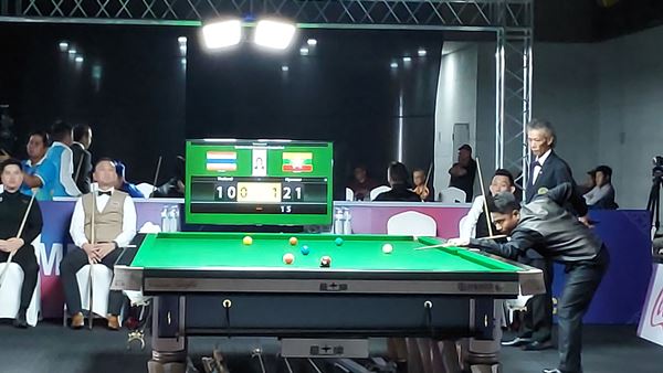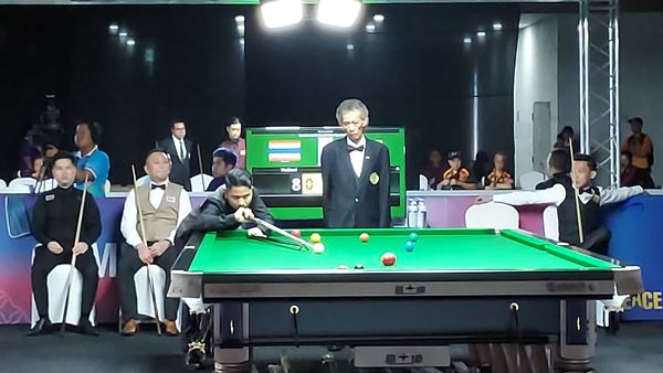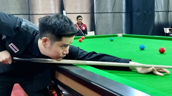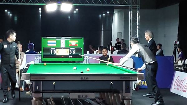 นายอำนาจ ชยานุรักษ์ ผู้ช่วยผู้จัดการทีมชาติไทย รายงานความเคลื่อนไหวของการแข่งขันกีฬาคิวสปอร์ตชิงชัย 10 เหรียญทอง ที่ห้างอิออน 2 ฮอลล์ 3 ประเทศกัมพูชา เมื่อวันที่ 10 พ.ค.วันที่สี่ของเกมแข่งขันว่า วันนี้ ทีมสนุกเกอร์ประเภทคู่ 6 แดง ที่จัดวัฒนา ภู่โอบอ้อม (ต๋อง ศิษย์ฉ่อย) คู่กับ กฤษณัส เลิศสัตยาทร (นุ้ก สงขลา) เจอกับทีมเมียนมาร์ในรอบ 8 คู่ โดยคู่สนุ้กไทยตามหลังเมียนมาร์ 0-2 ก่อนที่ นุ้ก สงขลา ออกมากดไม้เดียวไล่ขึ้นมา 1-2 แต่ทางเมียนมาร์วางเกมดีและเป็นฝ่ายแทงเก็บเฟรมสี่ขึ้นนำ 3-1 แต่หลังจากนั้นคู่ของต๋องกับนุ้ก สงขลา พลัดกันแทงคนละไม้เอาชนะไป 3 เฟรมรวดพลิกชนะเมียนมาร์ 4-3 เฟรม 8-44, 14-47,51-0,22-42,58-14,33-29,44-17 ผ่านเข้ารอบรองชนะเลิศเจอกับมาเลเซีย