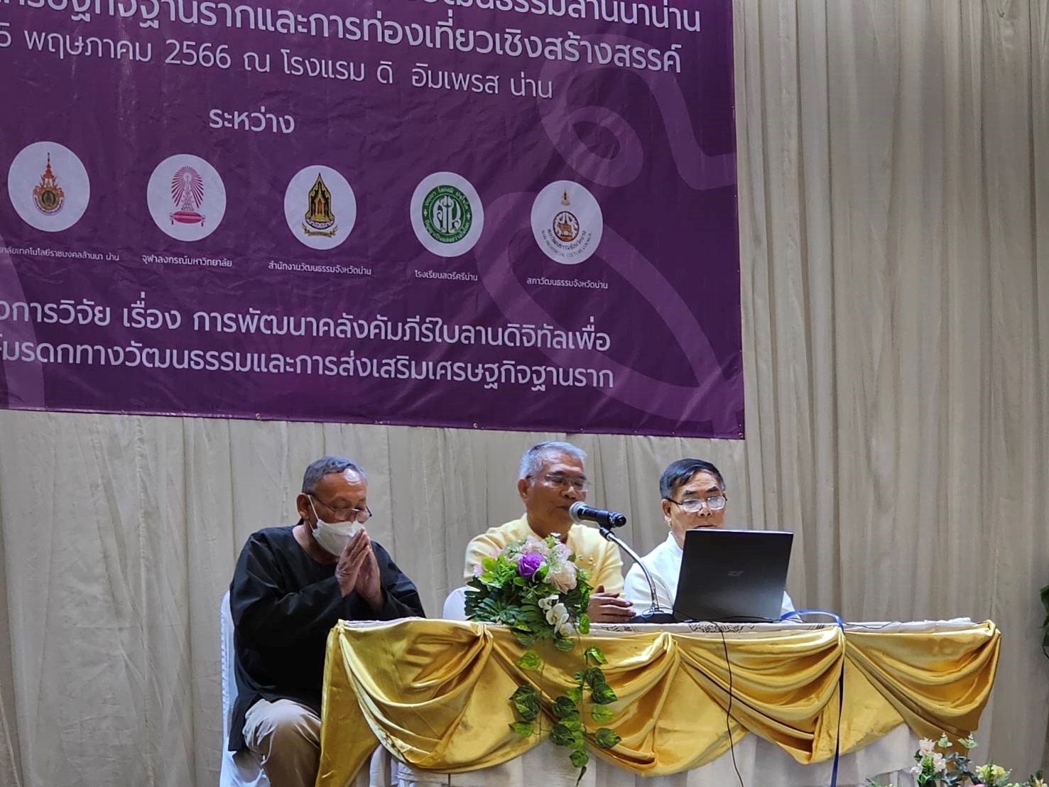 เมื่อวันที่ 15 พฤษภาคม 2566 เวลา 09.00 น. ณ ห้องดิ อิมเพรส คอนเวนชัน ฮอลล์ โรงแรมดิ อิมเพรส น่าน นายวิบูรณ์ แววบัณฑิต ผู้ว่าราชการจังหวัดน่าน เป็นประธานเปิดงานพิธีการลงนามบันทึกข้อตกลงความร่วมมือทางวิชาการ เรื่อง ความร่วมมือในการอนุรักษ์มรดกภูมิปัญญาทางวัฒนธรรมล้านนาน่าน เพื่อการพัฒนาเศรษฐกิจฐานรากและการท่องเที่ยวเชิงสร้างสรรค์ ภายใต้โครงการวิจัย เรื่อง การพัฒนาคลังคัมภีร์ใบลานดิจิทัลเพื่อการอนุรักษ์มรดกทางวัฒนธรรมและการส่งเสริมเศรษฐกิจฐานราก ซึ่งได้รับการสนับสนุนจากศูนย์กลางนวัตกรรมทางสังคมแห่งจุฬาลงกรณ์มหาวิทยาลัย หรือ CU Social Innovation Hub โดยมี ผู้ช่วยศาสตราจารย์ ดร.ฐิติรัตน์ ปั้นบำรุงกิจ ผู้ช่วยศาสตราจารย์ ดร.วชิราภรณ์ คลังธน-บูรณ์ และ อาจารย์ ดร.จนัธ เที่ยงสุรินทร์ เป็นนักวิจัยในโครงการ การจัดงานครั้งนี้เป็นการสร้างภาคีเครือข่ายความร่วมมือทั้งหกฝ่าย ประกอบด้วย สำนักงานวัฒนธรรมจังหวัดน่าน สำนักงานพระพุทธศาสนาจังหวัดน่าน สภาวัฒนธรรมจังหวัดน่าน มหาวิทยาลัยเทคโนโลยีราชมงคลล้านนา น่าน โรงเรียนสตรีศรีน่าน และจุฬาลงกรณ์มหาวิทยาลัย