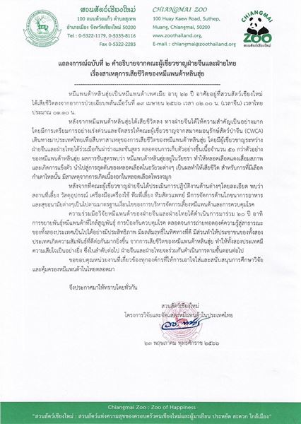 เมื่อเวลา 15.00 น. วันที่ 23 พ.ศ.2566 เว็บไซด์ https://chiangmai.zoothailand.org/ สวนสัตว์เชียงใหม่ ได้ออกแถลงการณ์ ฉบับที่ 2 คำอธิบายจากคณะผู้เชี่ยวชาญฝ่ายจีนและฝ่ายไทย เรื่อง สาเหตุการเสียชีวิตของหมีแพนด้าหลินฮุ่ย หมีแพนด้าหลินฮุ่ยเป็นหมีแพนด้าเพศเมีย อายุ 22 ปี อาศัยอยู่ที่สวนสัตว์เชียงใหม่ได้เสียชีวิตลงจากอาการป่วยเฉียบพลันเมื่อวันที่ 19 เมษายน 2566 เวลา 02.000 น. (เวลาจีน) เวลาไทยประมาณ 01.10 น.หลังจากหมีแพนด้าหลินฮุ่ยได้เสียชีวิตลง ทางฝ่ายนได้ให้ความสำคัญเป็นอย่างมาก