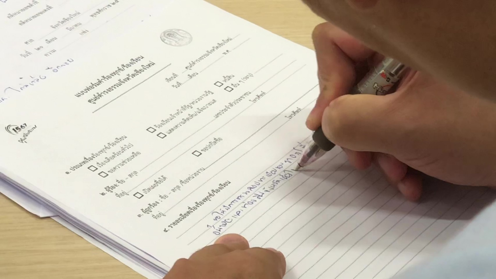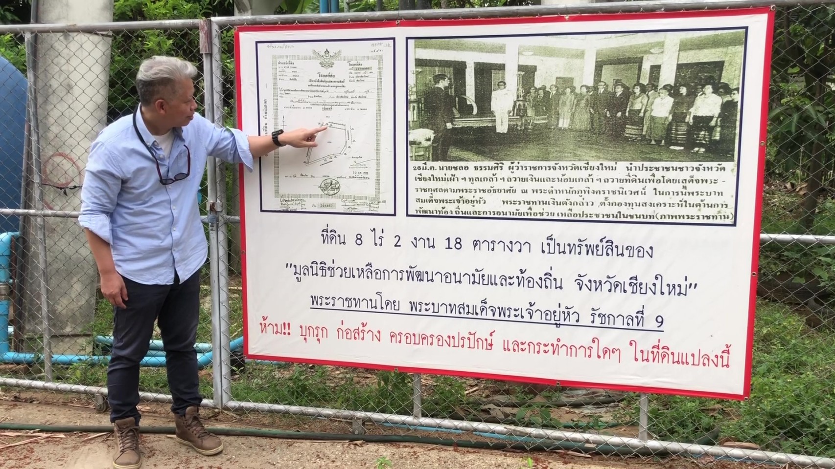 จากทั้งหมดประมาณ 40 หลัง ที่บุกรุกอยู่ในที่ดินกว่า 8 ไร่ของมูลนิธิฯ ในพื้นที่บ้านป่าข่อยเหนือ หมู่ที่1 ตำบลสันผีเสื้อ อำเภอเมือง จังหวัดเชียงใหม่ พร้อมทั้งขอให้ตรวจสอบด้วยสาธารณูปโภคต่างๆ ที่มีการพัฒนาสร้างขึ้นในที่ดินของมูลนิธิฯ เป็นการทำโครงการและใช้งบประมาณของหน่วยงานหรือส่วนราชการใด รวมทั้งดำเนินการอย่างถูกต้องตามกฎหมายหรือไม่อย่างไร เนื่องจากตามหลักแล้วไม่สามารถนำงบประมาณรัฐไปใช้ทำโครงการพัฒนาในที่ดินเอกชนได้ โดยมีนายวีระพงค์ วงศ์แสนศรี นิติกรชำนาญการพิเศษ ประจำศูนย์ดำรงธรรมจังหวัดเชียงใหม่ เป็นผู้รับหนังสือ เพื่อดำเนินการต่อไปตามกระบวนการ