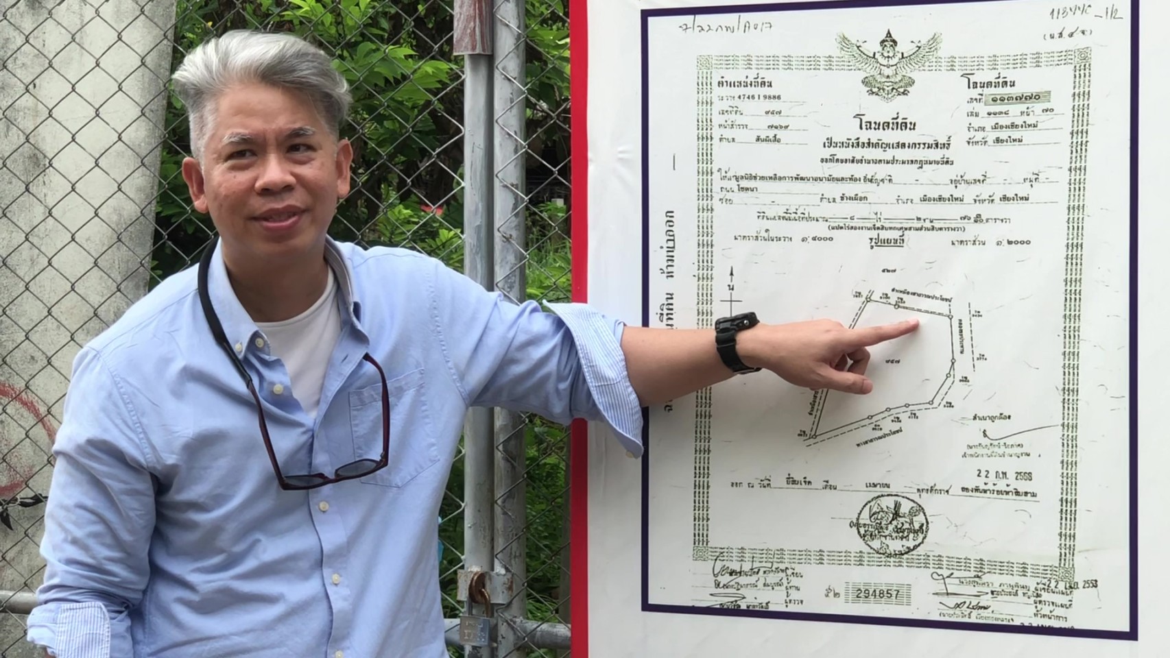 จากทั้งหมดประมาณ 40 หลัง ที่บุกรุกอยู่ในที่ดินกว่า 8 ไร่ของมูลนิธิฯ ในพื้นที่บ้านป่าข่อยเหนือ หมู่ที่1 ตำบลสันผีเสื้อ อำเภอเมือง จังหวัดเชียงใหม่ พร้อมทั้งขอให้ตรวจสอบด้วยสาธารณูปโภคต่างๆ ที่มีการพัฒนาสร้างขึ้นในที่ดินของมูลนิธิฯ เป็นการทำโครงการและใช้งบประมาณของหน่วยงานหรือส่วนราชการใด รวมทั้งดำเนินการอย่างถูกต้องตามกฎหมายหรือไม่อย่างไร เนื่องจากตามหลักแล้วไม่สามารถนำงบประมาณรัฐไปใช้ทำโครงการพัฒนาในที่ดินเอกชนได้ โดยมีนายวีระพงค์ วงศ์แสนศรี นิติกรชำนาญการพิเศษ ประจำศูนย์ดำรงธรรมจังหวัดเชียงใหม่ เป็นผู้รับหนังสือ เพื่อดำเนินการต่อไปตามกระบวนการ