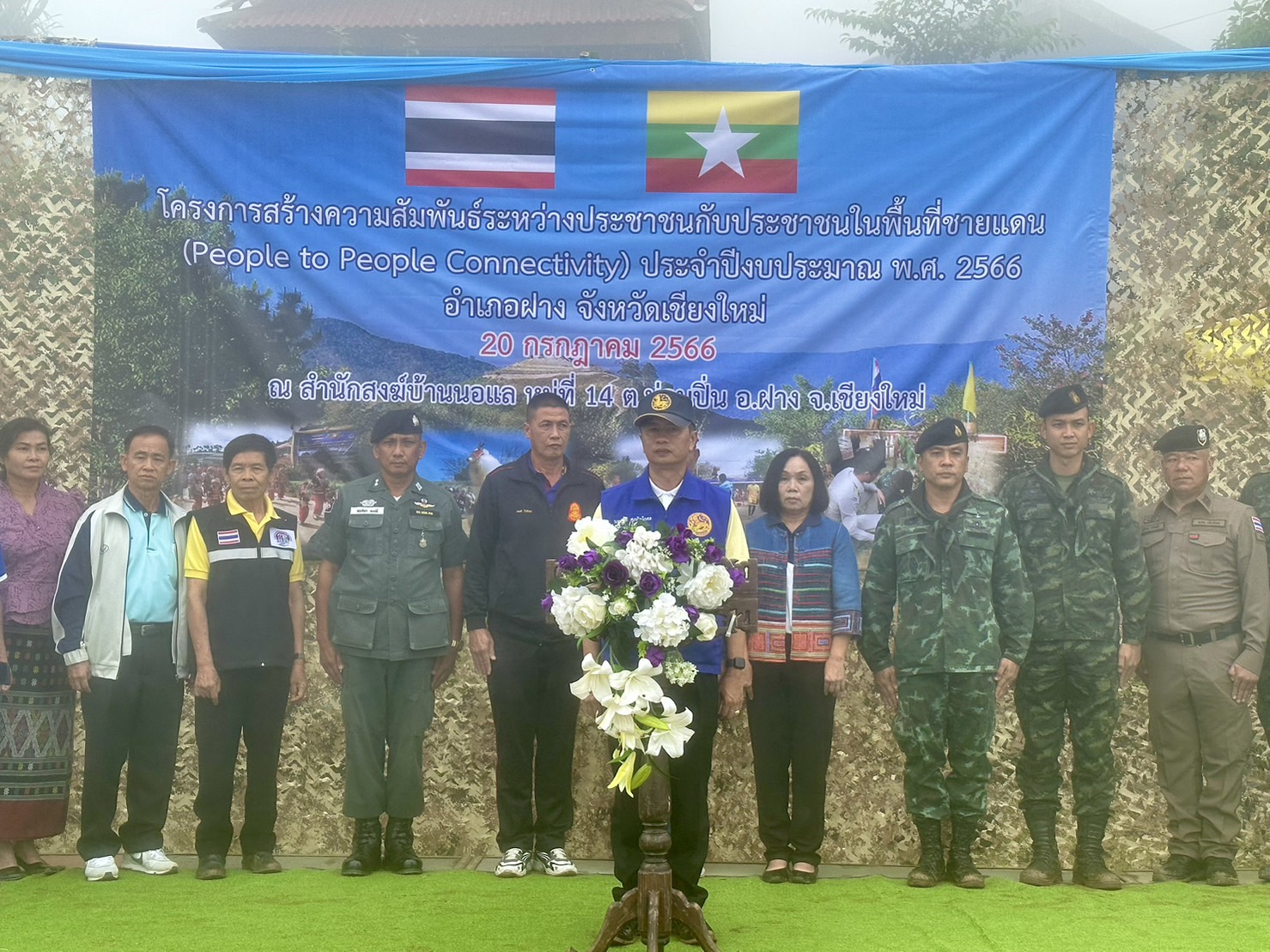วันที่ 20 กรกฎาคม 2566 เวลา 10.00 น. ณ สำนักสงฆ์บ้านนอแล หมู่ที่ 14 ตำบลม่อนปิ่น อำเภอฝาง จังหวัดเชียงใหม่ ว่าที่ร้อยตรี นพรัตน์ ศุภกิจโกศล นายอำเภอฝาง เป็นประธานเปิดโครงการสร้างความสัมพันธ์ระหว่างประชาชนและประชาชนในพื้นที่ชายแดน ไทย-เมียนมาร์ (People to People Connectivity) ประจำปีงบประมาณ พ.ศ.2566 โดยมีวัตถุประสงค์ เพื่อสร้างความเชื่อมโยงระดับประชาชนกับประชาชนในพื้นที่ชายแดน ไทย – เมียนมาร์