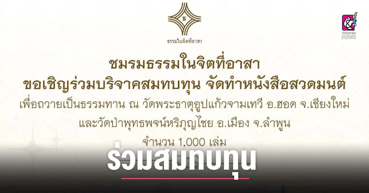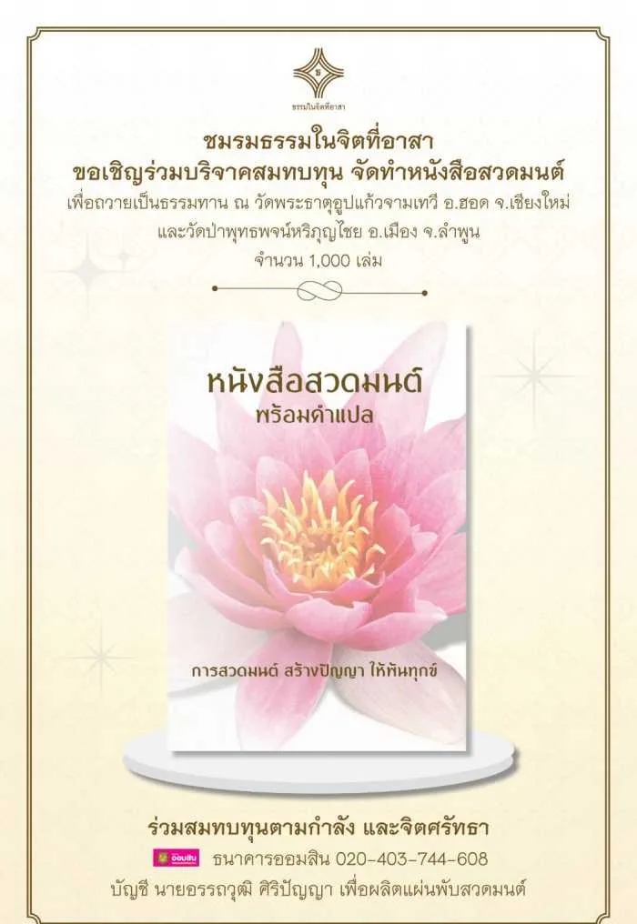 ชมรมธรรมในจิตที่อาสา ขอเชิญร่วมบริจาคสมทบทุน จัดทำหนังสือสวดมนต์ เพื่อถวายเป็นธรรมทาน ณ วัดพระธาตุอูปแก้วจามเทวี อ.ฮอด จ.เชียงใหม่ และวัดป่าพุทธพจน์หริภุญไชย อ.เมือง จ.ลำพูน