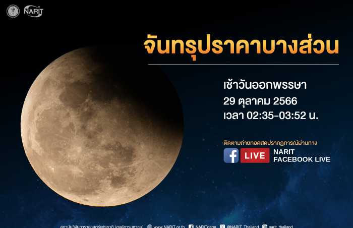 นายศุภฤกษ์ คฤหานนท์ ผู้อำนวยการศูนย์บริการวิชาการและสื่อสารทางดาราศาสตร์ สดร. เปิดเผยว่า เช้ามืดวันที่ 29 ตุลาคม 2566 ซึ่งตรงกับดวงจันทร์เต็มดวงในเช้าวันออกพรรษา จะเกิดปรากฏการณ์จันทรุปราคาบางส่วน สังเกตได้บริเวณทวีปยุโรป เอเชีย ออสเตรเลีย แอฟริกา อเมริกาเหนือ อเมริกาใต้ แปซิฟิก แอตแลนติก มหาสมุทรอินเดีย อาร์กติก แอนตาร์กติกา สำหรับประเทศไทยเริ่มสังเกตได้ตั้งแต่เวลาประมาณ 01:01 – 05:26 น. (เวลาท้องถิ่น ณ กรุงเทพมหานคร) ดวงจันทร์เข้าสู่เงามัวของโลก เกิดปรากฏการณ์จันทรุปราคาเงามัว เวลาประมาณ 01:01 น. แสงสว่างของดวงจันทร์จะลดลงเล็กน้อย สังเกตด้วยตาเปล่าได้ค่อนข้างยาก จนกระทั่งเวลาประมาณ 02:35 น. ดวงจันทร์เข้าสู่เงามืดของโลก เกิดปรากฏการณ์จันทรุปราคาบางส่วน ดวงจันทร์เต็มดวงจะค่อย ๆ เว้าแหว่งไปทีละน้อย เงาโลกบังมากที่สุด เวลาประมาณ 03:14 น. ประมาณร้อยละ 6 ของเส้นผ่านศูนย์กลางดวงจันทร์ จนสิ้นสุดปรากฏการณ์จันทรุปราคาบางส่วนในเวลาประมาณ 03:52 น. รวมเวลาเกิดจันทรุปราคาบางส่วนนาน 1 ชั่วโมง 17 นาที จากนั้นดวงจันทร์เข้าสู่เงามัวของโลกอีกครั้ง และสิ้นสุดปรากฏการณ์จันทรุปราคาโดยสมบูรณ์ในเวลาประมาณ 05:26 น.