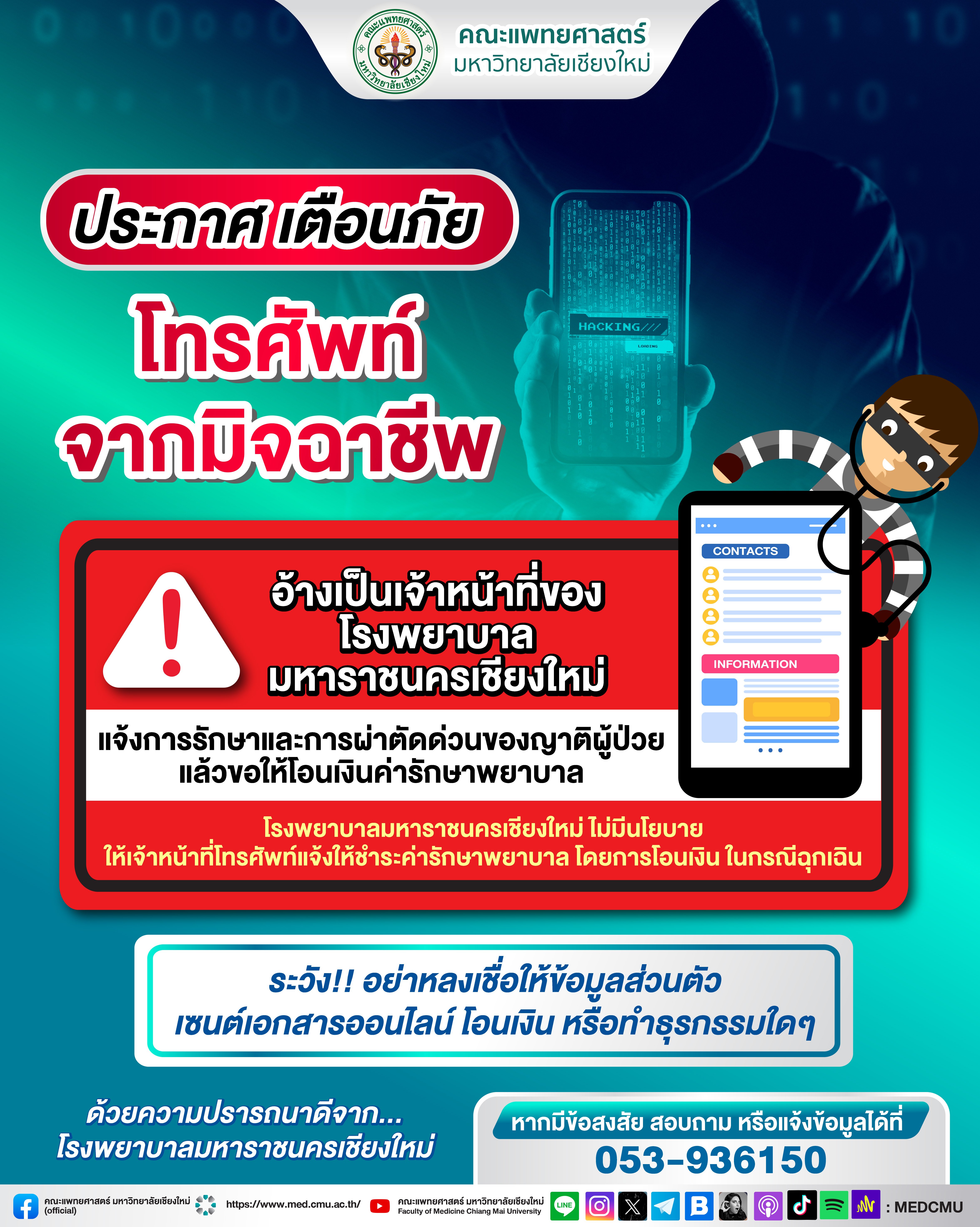 🔹โรงพยาบาลมหาราชนครเชียงใหม่ ไม่มีนโยบาย ให้เจ้าหน้าที่โทรศัพท์แจ้งให้ชำระค่ารักษาพยาบาล โดยการโอนเงิน ในกรณีฉุกเฉิน