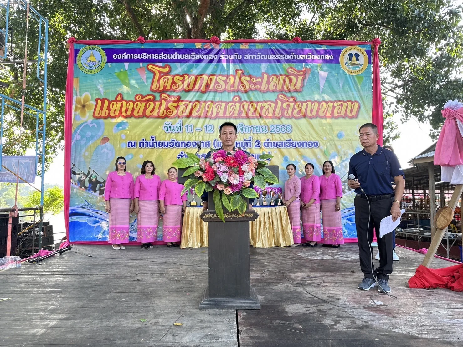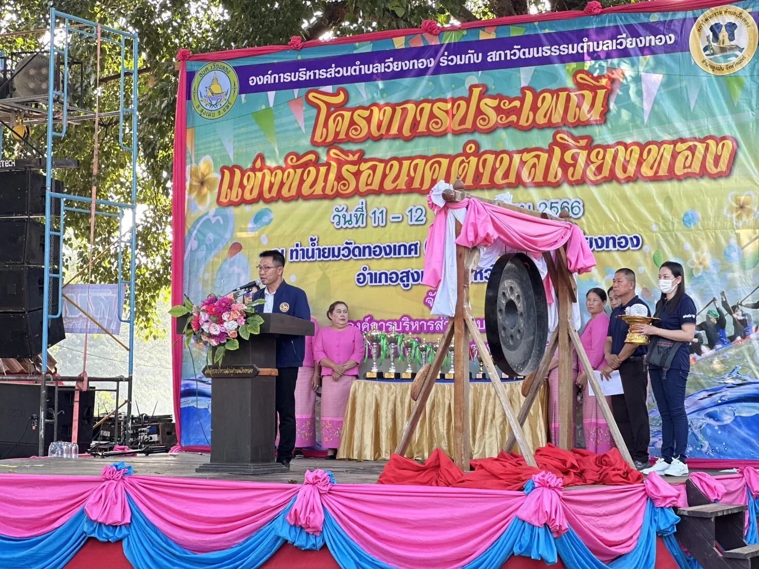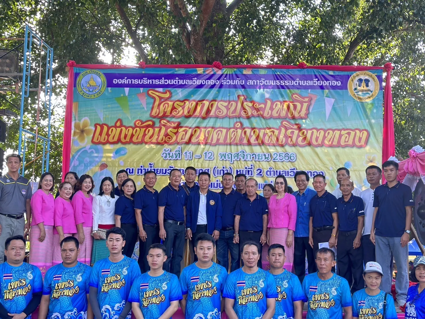 โดยมีนายเสรี เวียงนาค นายกองค์การบริหารส่วนตำบลเวียงทอง กล่าวต้อนรับ นายพงษ์ศักดิ์ แก้วธรรมานุกูล ประธานสภาวัฒนธรรมตำบลเวียงทอง กล่าวรายงาน พร้อมด้วย ผู้บริหาร,เจ้าหน้าที่องค์การบริหารส่วนตำบลเวียงทอง ชมรมกำนันผู้ใหญ่บ้านตำบลเวียงทอง นักกีฬาแข่งเรือพายและพี่น้องชาวตำบลเวียงทอง เข้าร่วมพิธีเปิดฯ ในครั้งนี้ ภายในงานมีพิธีเจริญพระพุทธมนต์ ทำบุญตักบาตรข้าวสารอาหารแห้ง ถวายเครื่องสังฆทาน ถวายผ้าป่าสามัคคี พร้อมมีการแสดงดนตรีพื้นบ้านตำบลเวียงทองและการแข่งขันการแข่งเรือนาคตำบลเวียงทอง สำหรับการจัดงานในปีนี้ มีเรือนาคเข้าร่วมแข่งขันจำนวน 6ลำ โดยแบ่งตามศรัทธาวัดในตำบลเวียงทอง ได้แก่ ศรัทธาวัดไชยามาตย์ ศรัทธาวัดทองเกศ ศรัทธาวัดน้ำบ่อ ศรัทธาวัดโพธิสุนทร ศรัทธาวัดเขื่อนคำลือ และศรัทธาวัดผาสุก นอกจากนี้ ยังมียังมีการแข่งขันเรือเล็ก (เรืออิป๋อง) และการแข่งขันมวยทะเล จำนวน 12 หมู่บ้าน ซึ่งการแข่งขันจัดขึ้นระหว่างวันที่ 11-12 พฤศจิกายน 2566