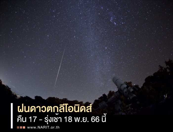 นายศุภฤกษ์ คฤหานนท์ ผู้อำนวยการ ศูนย์บริการวิชาการและสื่อสารทางดาราศาสตร์ สดร. เปิดเผยว่า “ฝนดาวตกลีโอนิดส์” หรือ ฝนดาวตกกลุ่มดาวสิงโต จะเกิดในช่วงระหว่างวันที่ 6 – 30 พฤศจิกายน ของทุกปี ในปี 2566 นี้ จะมีอัตราการตกสูงสุดหลังเที่ยงคืนวันที่ 17 พฤศจิกายน 2566 เวลาประมาณ 01:00 น. จนถึงรุ่งเช้าวันที่ 18 พฤศจิกายน 2566 ศูนย์กลางการกระจายอยู่บริเวณกลุ่มดาวสิงโต ทางทิศตะวันออก ในคืนดังกล่าวไร้แสงจันทร์รบกวน สามารถสังเกตการณ์ได้ด้วยตาเปล่าในที่มืดสนิท โดยจะปรากฏให้เห็นเป็นแสงสว่างวาบคล้ายลูกไฟ พาดผ่านท้องฟ้า ไม่จำเป็นต้องมองผ่านกล้องโทรทรรศน์ เนื่องจากการเกิดฝนดาวตกจะเกิดขึ้นทั่วท้องฟ้าบริเวณกว้าง