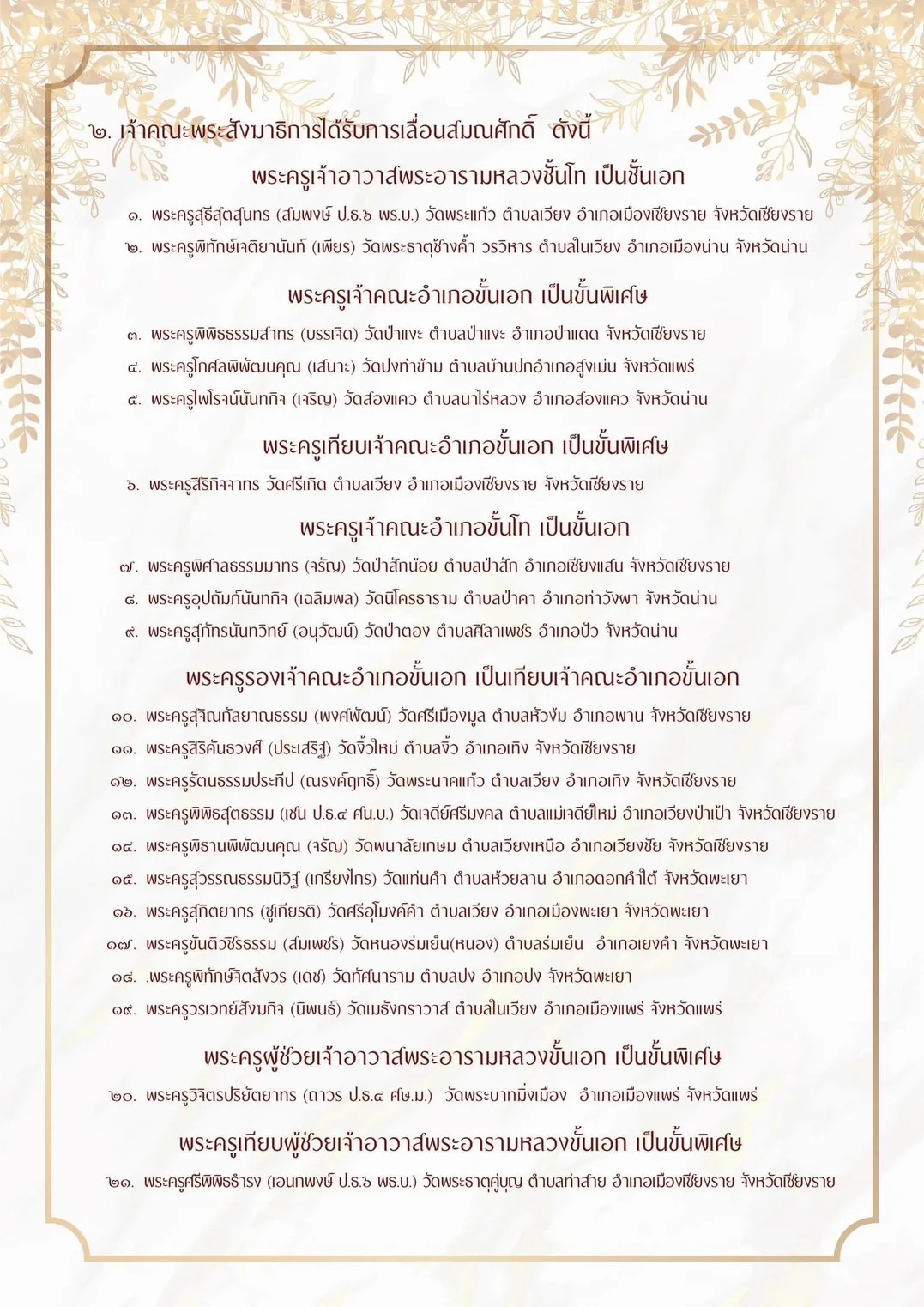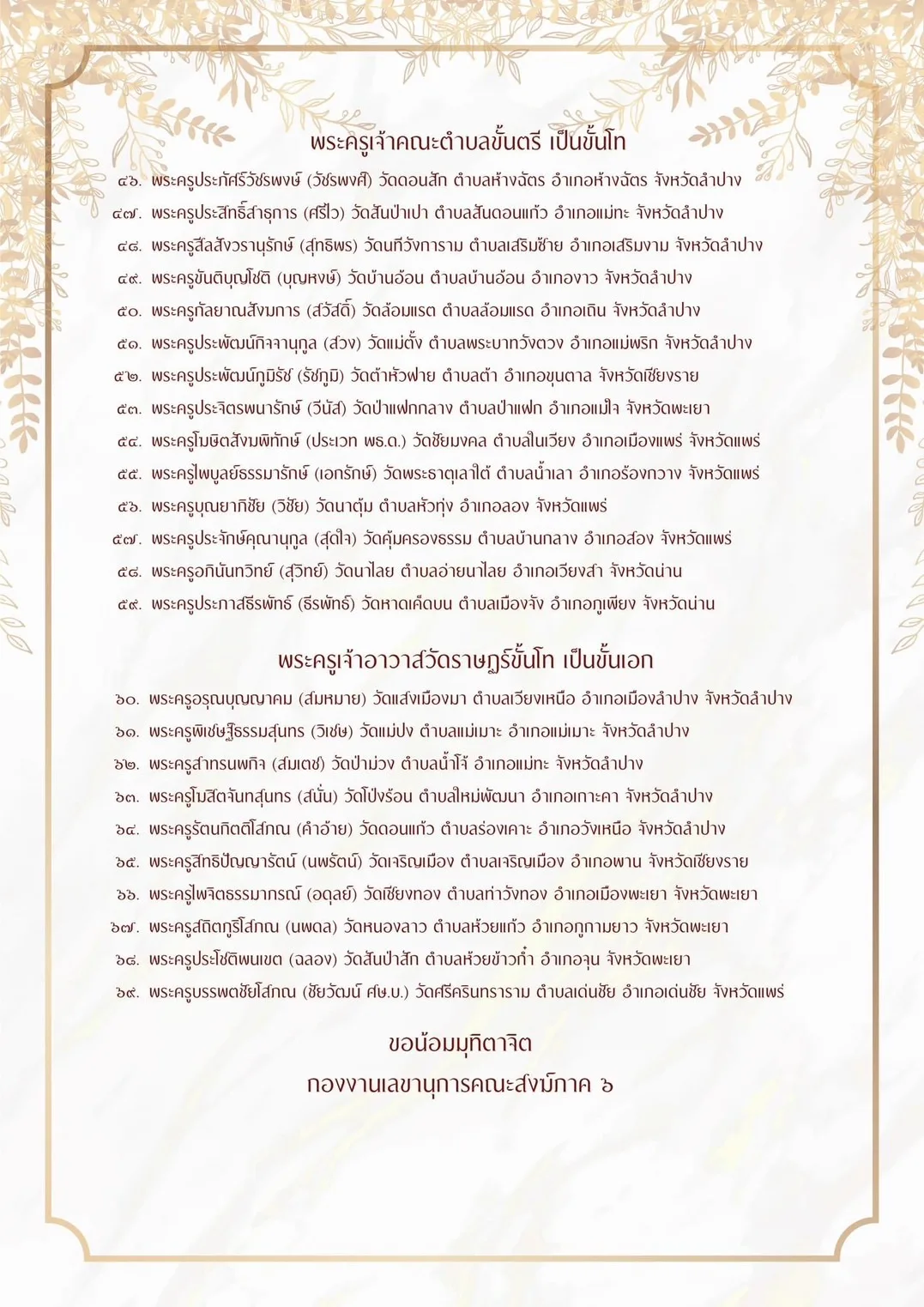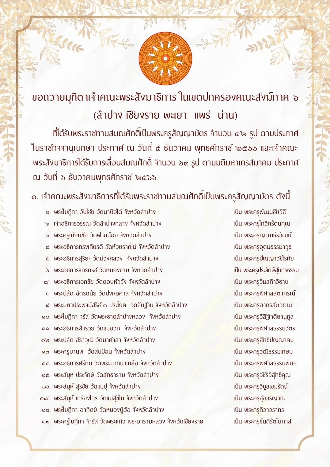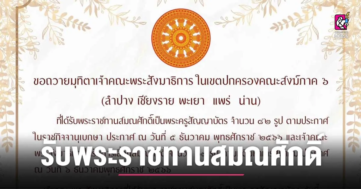 ผู้สื่อข่าวรายงานว่ากองงานเลขานุการคณะสงฆ์ ภาค 6 ได้ขอถวายมุทิ ตาเจ้าคณะพระสังมาธิการ ในเขตปกครองคณะสงฆ์ภาค 6 (ลำปาง เชียงราย พะเยา แพร่ น่าน) ที่ได้รับพระราชทานสมณศักดิ์เป็นพระครูสัญญาบัตร จำนวน 82 รูป ตามประกาศ ในราชกิจจานุเบกษา ประกาศ ณ วันที่ 5 ธันวาคม พุทธศักราช 2566 และเจ้าคณะ พระสังมาธิการได้รับการเลื่อนสมณศักดิ์ จำนวน 69 รูป ตามมติมหาเถรสมาคม ประกาศ