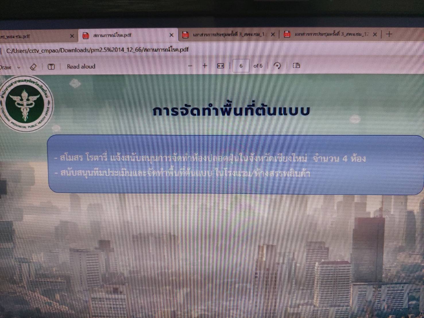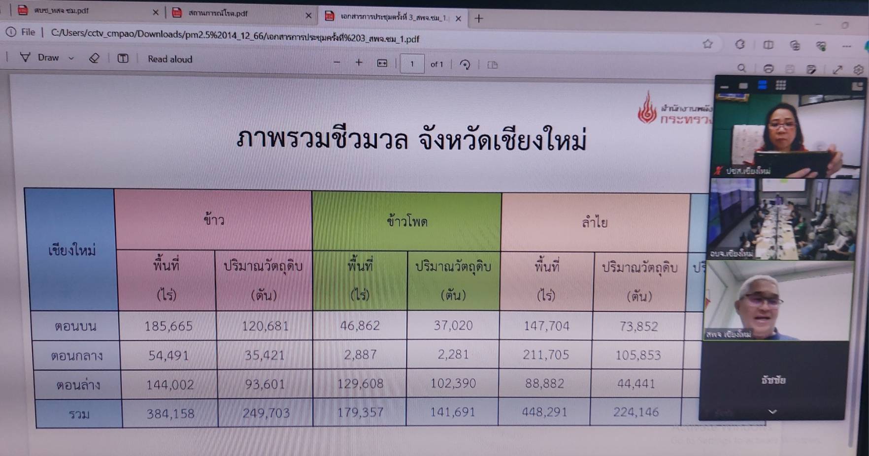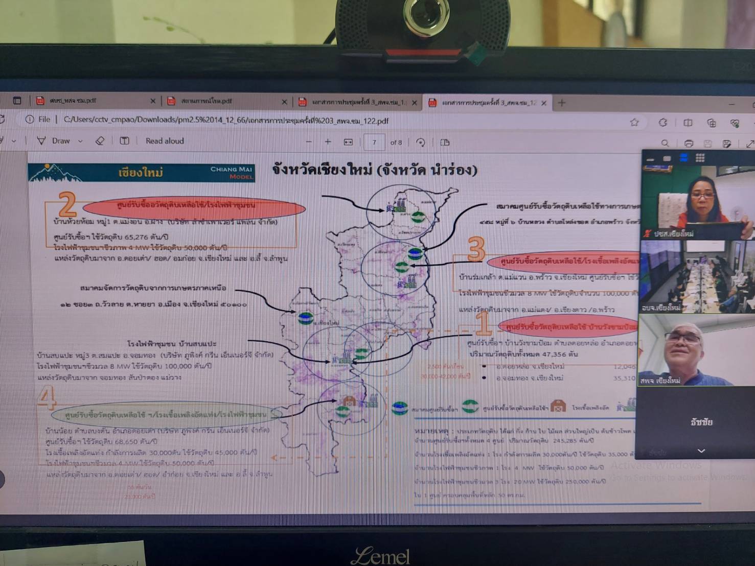 โดยที่ประชุมได้มีการรายงานสถานการณ์ไฟป่าหมอกควัน และฝุ่นละอองขนาดเล็ก(PM2.5)ในรอบสัปดาห์ที่ผ่านมา ซึ่งมีจุดความร้อนเกิดขึ้นในหลายพื้นที่ อาทิ ที่ อ.แม่อาย พื้นที่ป่าอนุรักษ์ ป่าสงวน และพื้นที่ สปก. ได้มีการเน้นย้ำไปถึงเกษตรกรเรื่องการขออนุญาตเผาผ่านแอพพลิเคชั่นไฟดี ทั้งนี้หน่วยงานที่เกี่ยวข้องจะต้องรับผิดชอบในการกำกับดูแล แนะนำให้เกษตรกรปรับเปลี่ยนพฤติกรรมเลิกเผาวัสดุเหลือใช้ทางการเกษตร และจากสรุปผลการดำเนินงานในรอบสัปดาห์ที่ผ่านมาสำหรับพื้นที่กลุ่มป่า 7 กลุ่มป่าและพื้นที่พิเศษ หน่วยงานรับผิดชอบได้มีการประชุมหารือวางแผน กำหนดพื้นที่การบริหารจัดการเชื้อเพลิง และอัพเดทข้อมูลไฟป่าอยู่ตลอดเวลา โดยเฉพาะพื้นที่ที่มีจุด Hot Spot สูงสุดในปี 2566 ให้มีการเข้มงวดเป็นกรณีพิเศษ เน้นย้ำให้ทุกองค์กรปกครองส่วนท้องถิ่นลงทะเบียนขออนุญาตเผา และสร้างความรู้ความเข้าใจในการกรอกข้อมูลในแอพพลิเคชั่นไฟดีภายในเดือนธันวาคม 2566