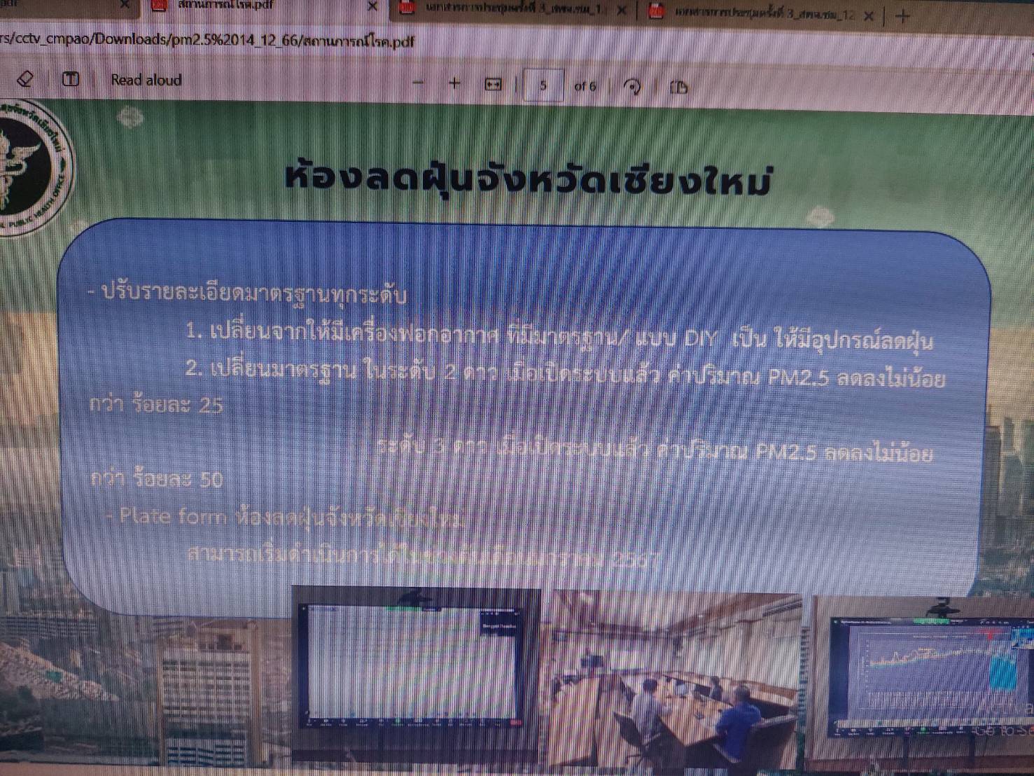 ปัจจุบัน สถานการณ์ไฟป่าหมอกควันและฝุ่นละอองขนาดเล็ก(PM2.5) ในพื้นที่จังหวัดเชียงใหม่ยังไม่มีความรุนแรง สภาพอากาศอยู่ในระยะที่ยังปลอดภัย ขณะเดียวกัน มีรายงานจากสาธารณสุขจังหวัดเชียงใหม่ถึงผลการเฝ้าระวังผลกระทบต่อสุขภาพ 4 กลุ่มโรค อันเนื่องมาจากฝุ่นละอองขนาดเล็ก(PM2.5) ได้แก่ โรคทางเดินหายใจเฉียบพลัน โรคตาอักเสบ โรคหัวใจและหลอดเลือด และโรคผิวหนังอักเสบ ว่า ขณะนี้ยังไม่พบผู้ป่วยเพิ่มขึ้น แต่ทางหน่วยงานรับผิดชอบได้มีการปรับรายละเอียดมาตรฐานห้องลดฝุ่นจังหวัดเชียงใหม่ โดยเปลี่ยนจากให้มีเครื่องฟอกอากาศที่มีมาตรฐาน/แบบ DIY เป็นให้มีอุปกรณ์ลดฝุ่น เปลี่ยนมาตรฐานในระดับ 2 ดาว เมื่อเปิดระบบแล้ว ค่าปริมาณ PM2.5 ลดลงไม่น้อยกว่าร้อยละ 25 ระดับ 3 ดาว เมื่อเปิดระบบแล้ว ค่าปริมาณ PM2.5 ลดลงไม่น้อยกว่าร้อยละ 50 และจะมีการพัฒนา Platform ห้องลดฝุ่นจังหวัดเชียงใหม่ โดยจะสามารถเริ่มใช้ได้ในเดือนมกราคม 2567
