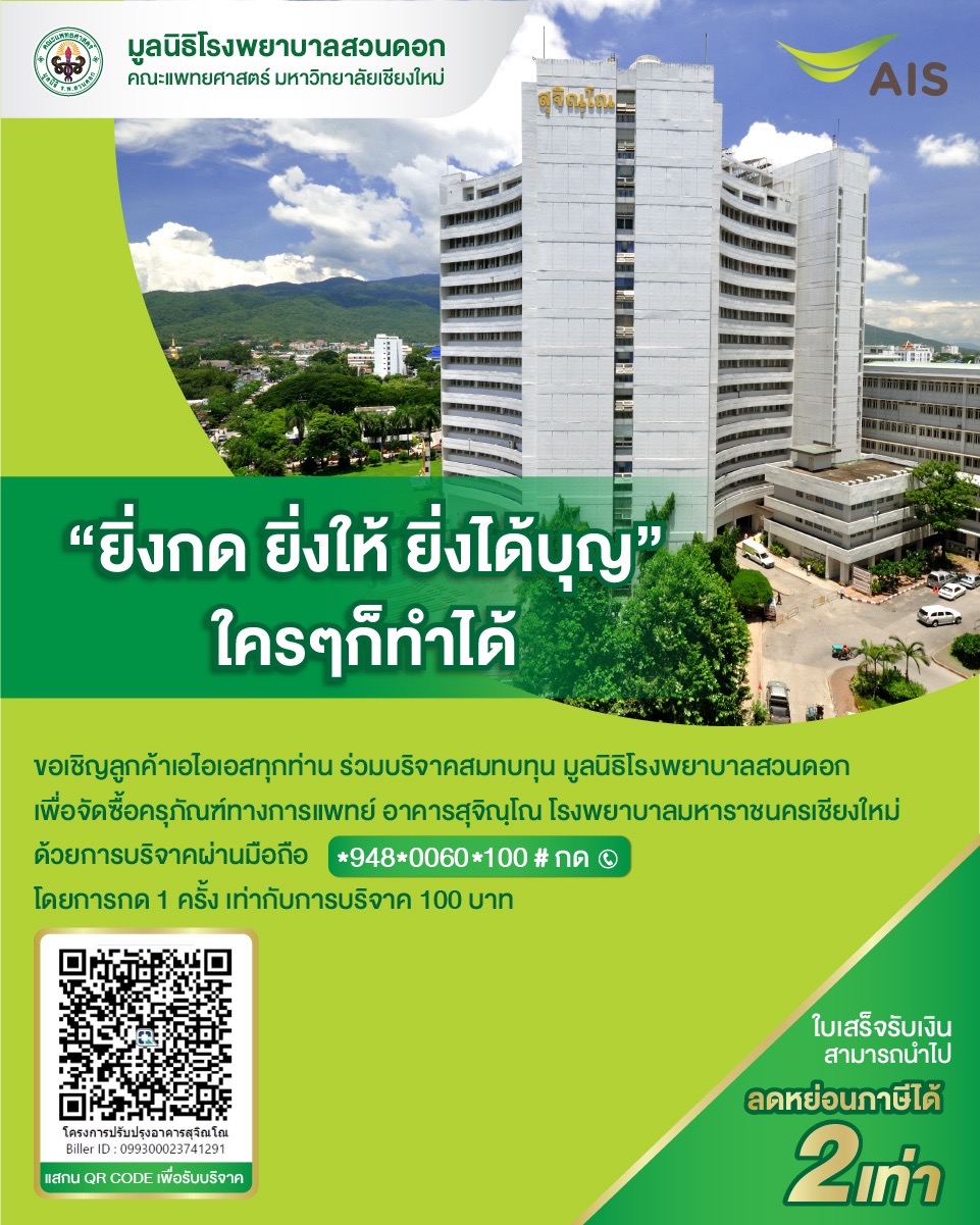 พร้อมขอเชิญทุกท่าน ร่วมบริจาคสมทบทุน มูลนิธิโรงพยาบาลสวนดอกเพื่อจัดซื้อครุภัณฑ์ทางการแพทย์อาคารสุจิณฺโณ โรงพยาบาลมหาราชนครเชียงใหม่ ด้วยการบริจาคผ่านมือถือ ที่หมายเลข 9480060*100# แล้วกดโทรออก โดยการกด 1ครั้ง เท่ากับการบริจาค100บาท