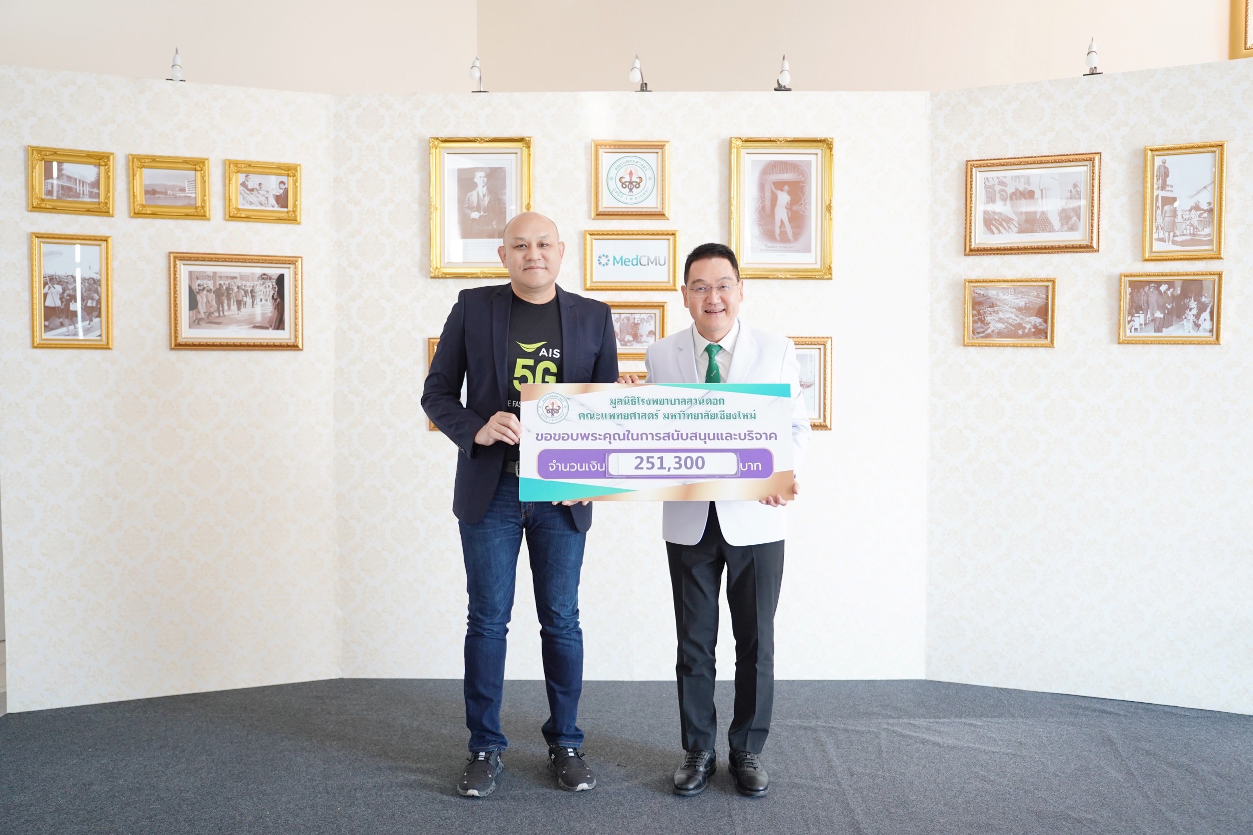 21 ธันวาคม 2566 : นายอาทยา หยู่เย็น หัวหน้างานปฏิบัติการภูมิภาค-ภาคเหนือ เอไอเอส เข้ามอบเงินบริจาค จำนวน 251,300 บาท ต่อ ศ.(เชี่ยวชาญพิเศษ) นพ.บรรณกิจ โลจนาภิวัฒน์ คณบดีคณะแพทยศาสตร์ มช. โดยยอดเงินบริจาคนี้มาจากผู้มีจิตศรัทธาที่ร่วมบริจาคผ่านระบบ USSD บริษัท แอดวานซ์ อินโฟร์ เซอร์วิส จำกัด (AIS) เพื่อสมทบทุนโครงการจัดซื้อครุภัณฑ์ทางการแพทย์ อาคารสุจิณโณ โรงพยาบาลมหาราชนครเชียงใหม่