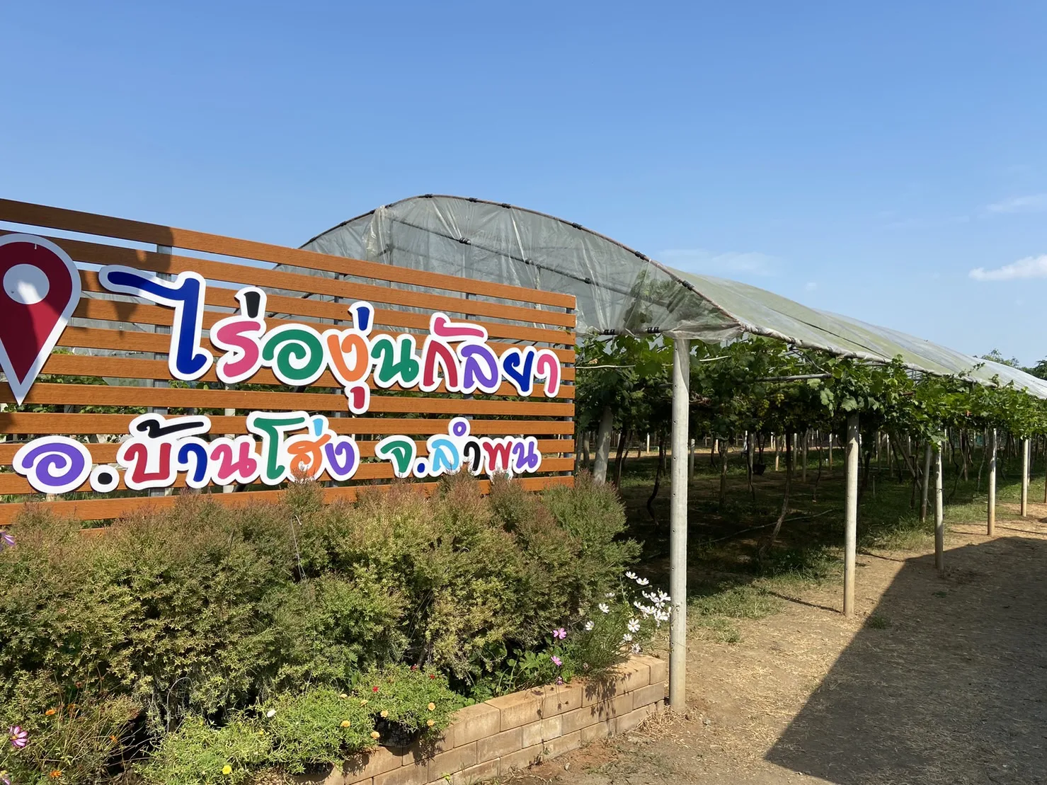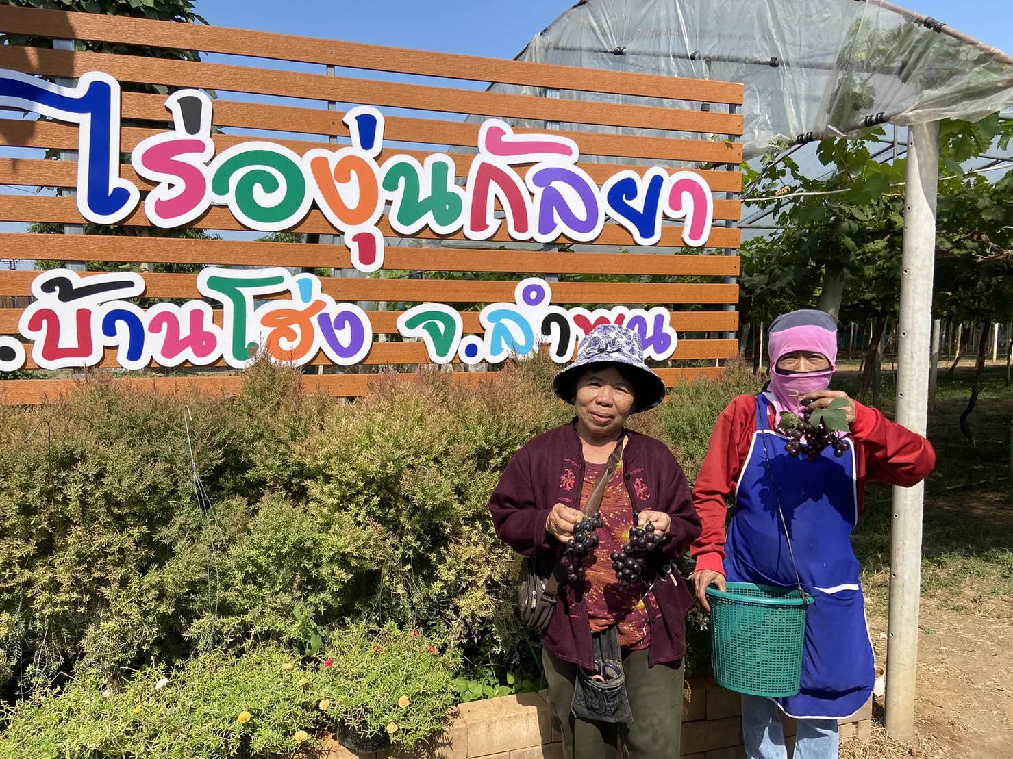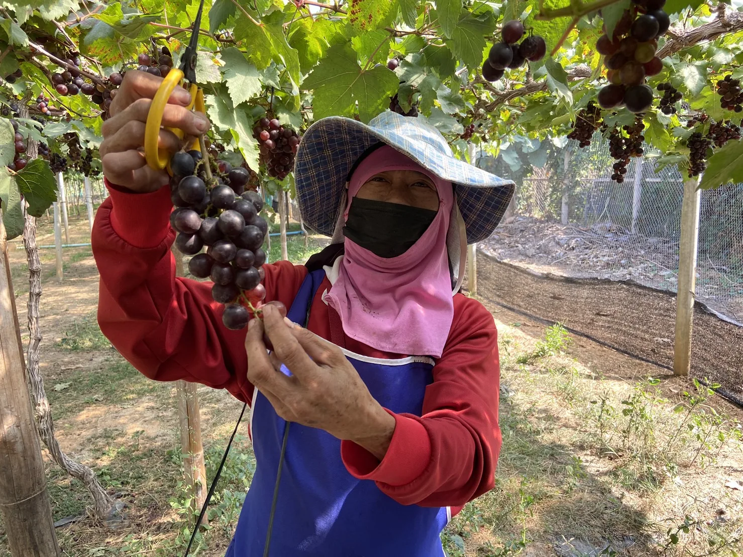 โดยมีหญิงวัยชราคอยต้อนรับเชื้อเชิญลูกค้าอยู่หน้าสวน ทราบชื่อว่า “ยายคำ” กัลยา เตจ๊ะ อายุ 68 ปี เป็นเจ้าของสวนองุ่น พร้อมกันนี้ได้พาเที่ยวชมสวนองุ่นที่ออกลูกเต็มสวน
