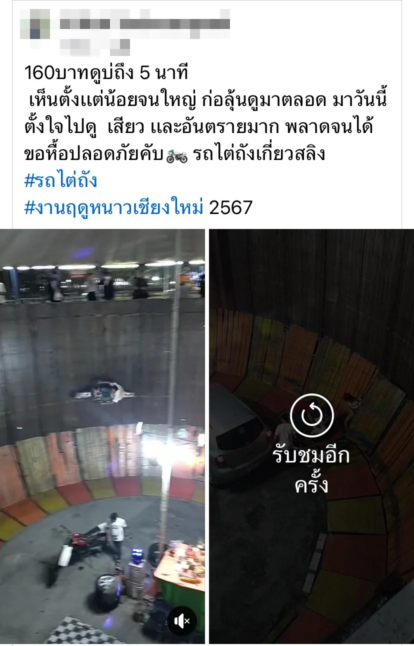 จากผู้ใช้เฟสบุ๊ค มีข้อความว่า 160 บาท ดูไม่ถึง 5 นาที เห็นตั้งแต่เด็กจนใหญ่ ก็ลุ้นมาตลอด มาวันนี้ตั้งใจไปดู เสียว และอันตรายมาก พลาดจนได้ ขอหื้อปลอดภัยคับ รถไต่ถังเกี่ยวสลิง