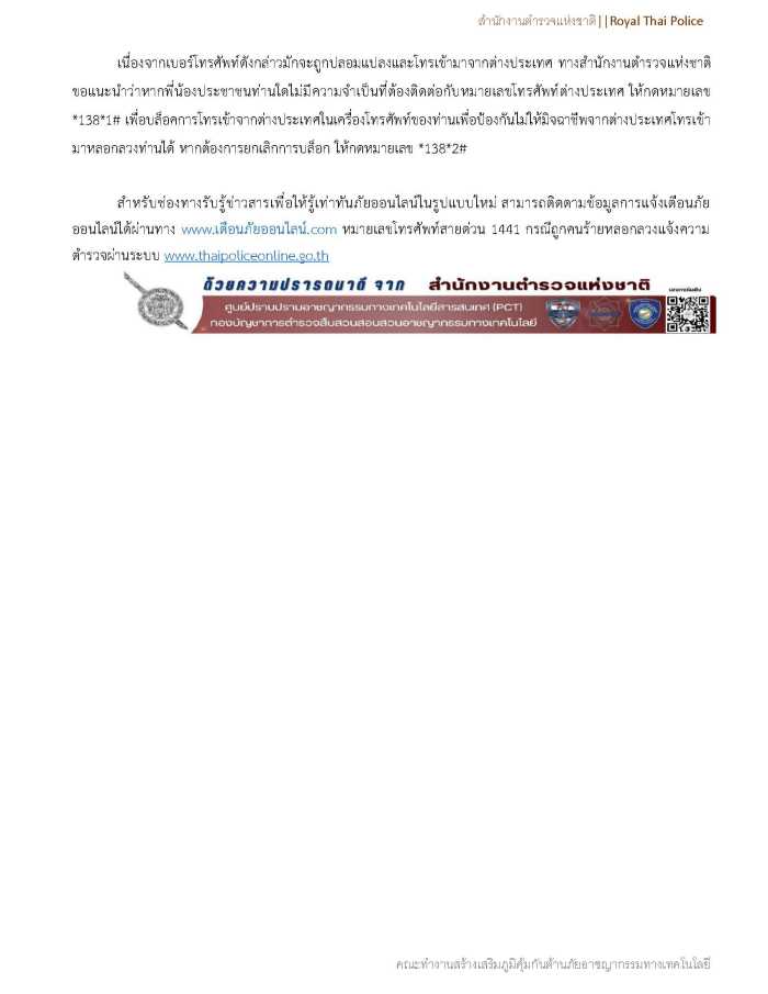 สำหรับช่องทางรับรู้ข่าวสารเพื่อให้รู้เท่าทันภัยออนไลน์ในรูปแบบใหม่ สามารถติดตามข้อมูลการแจ้งเตือนภัยออนไลน์ได้ผ่านทาง www.เตือนภัยออนไลน์.com หมายเลขโทรศัพท์สายด่วน 1441 กรณีถูกคนร้ายหลอกลวงแจ้งความตำรวจผ่านระบบรับแจ้งความออนไลน์ www.thaipoliceonline.go.th